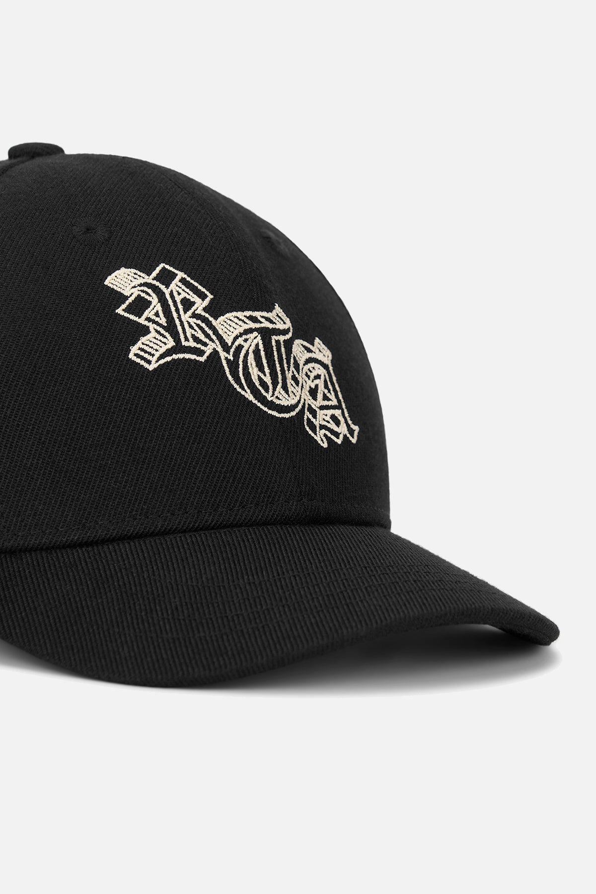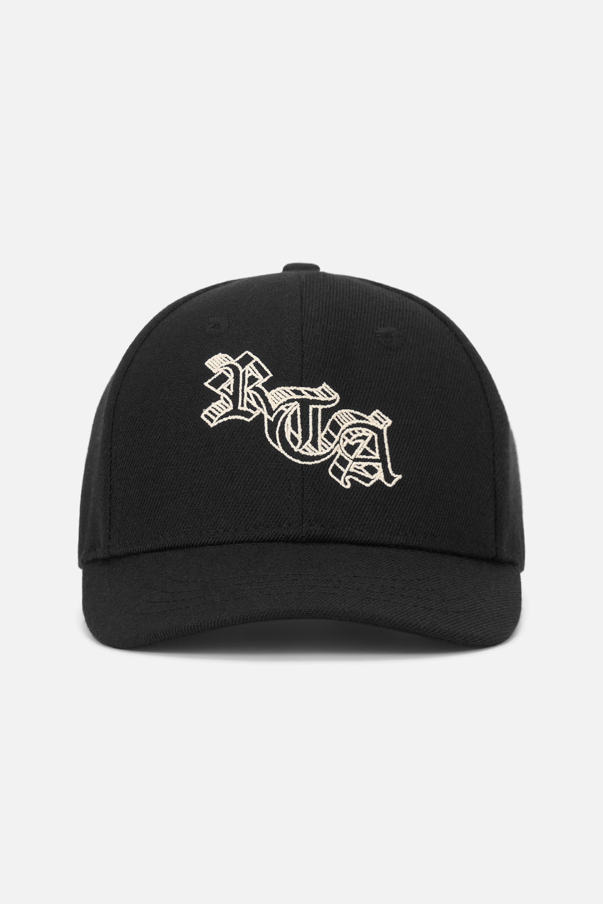 The Nilson Hat in Black 3D Old English is a 6 panel cap with an adjustable snapback closure and features a large RTA graphic in a 3D Old English font.