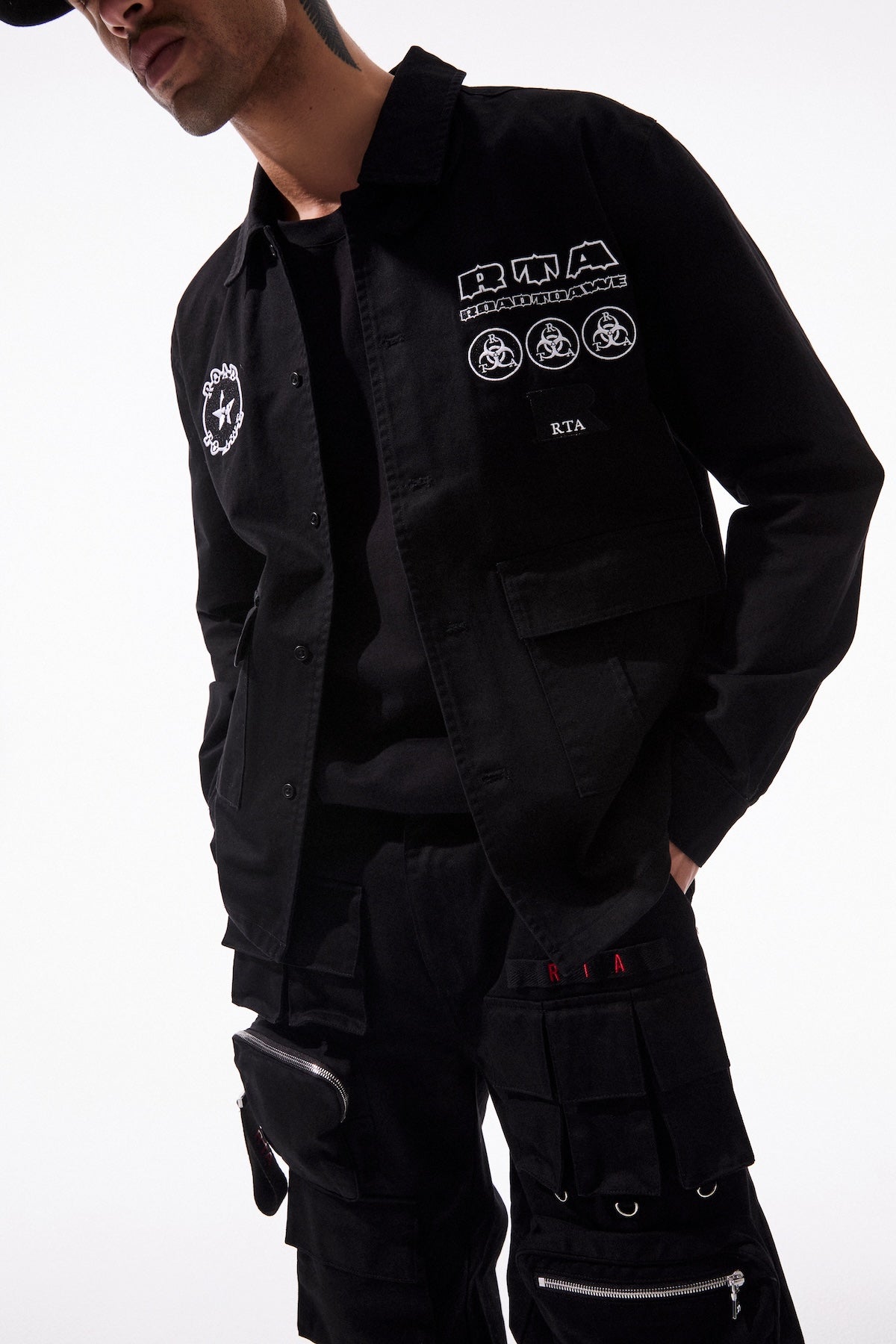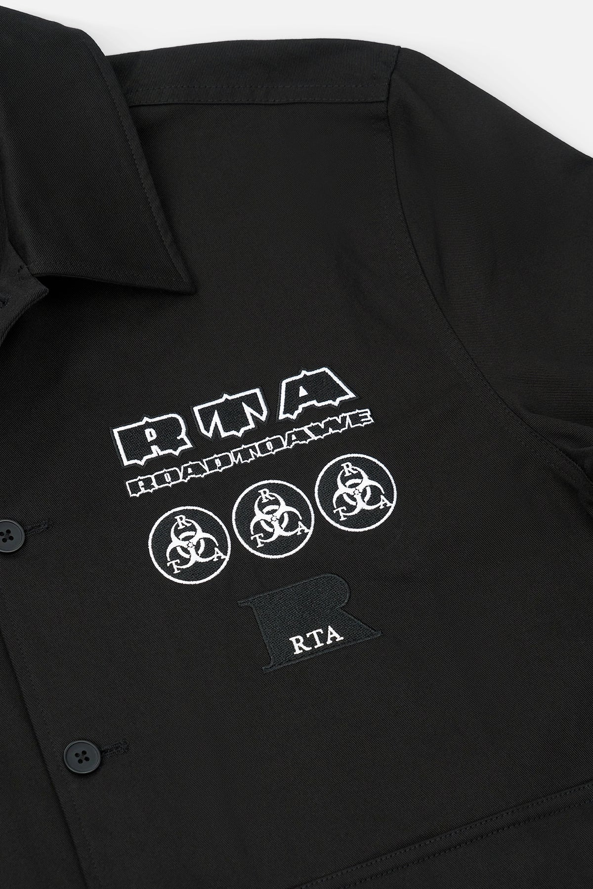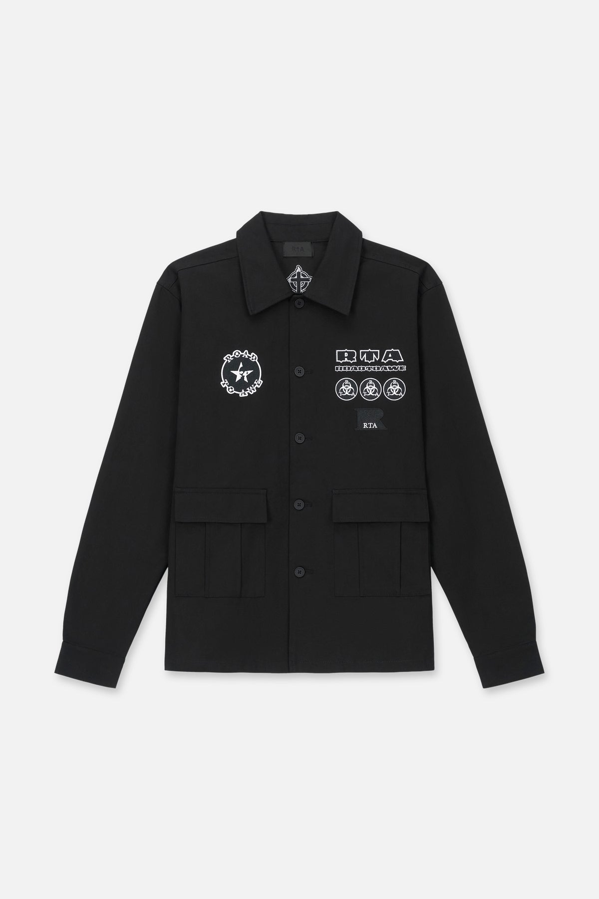 The Nilton Top in Black Military Patch is made from 100% Cotton. This shirt is designed with a classic, turn-down collar, button front closure, adjustable button cuffs, front flap pockets and features original, military-inspired RTA graphic patches.