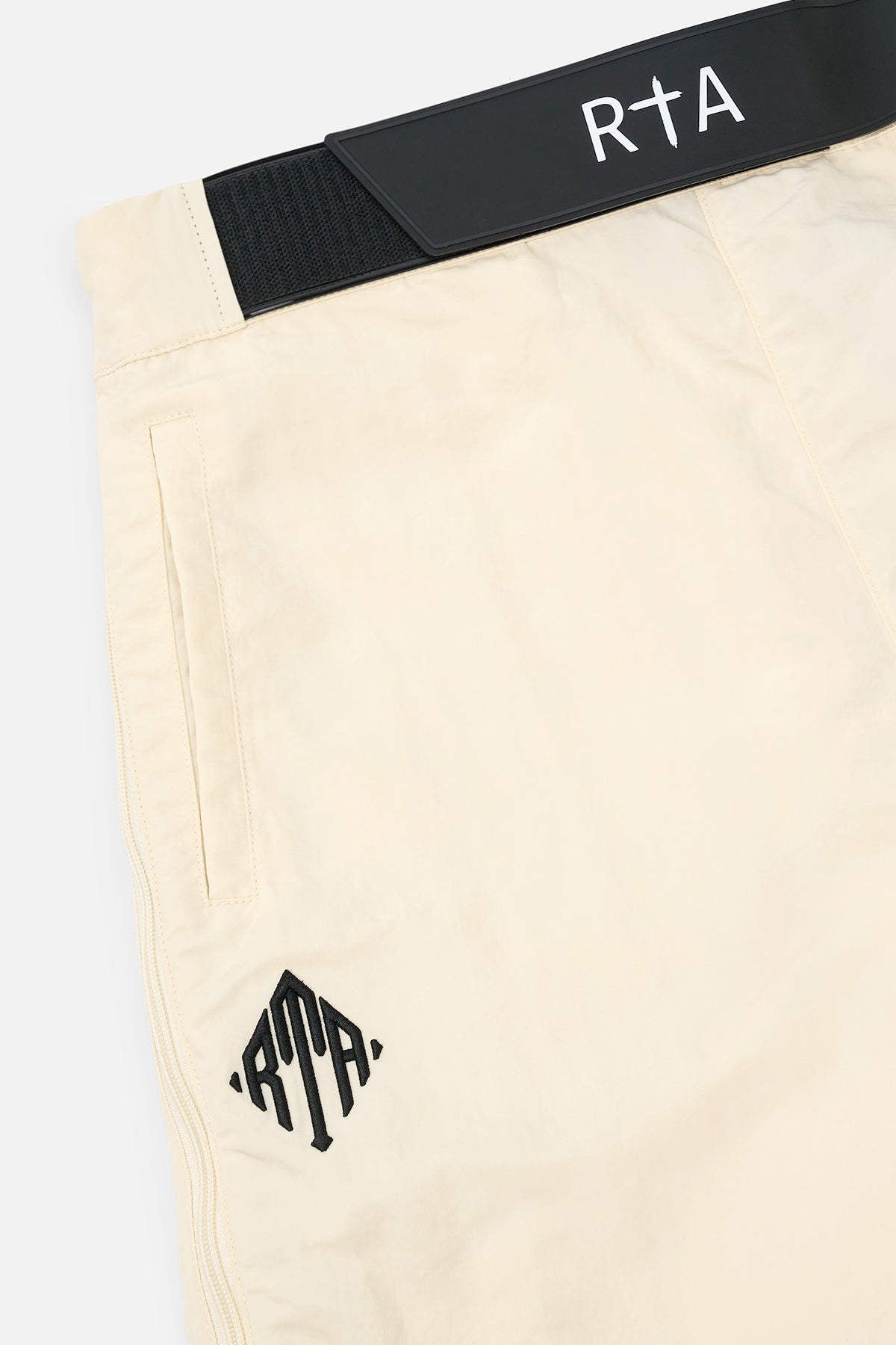 The Nixon Track Pant in Raw Sand is made from lightweight woven fabric with a relaxed, straight-leg silhouette and elasticized waistband. The pant features subtle side piping, tonal zip pockets, and graphic RtA branding along the leg. Finished with adjustable zip hems.