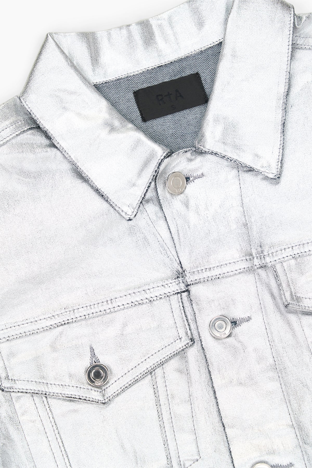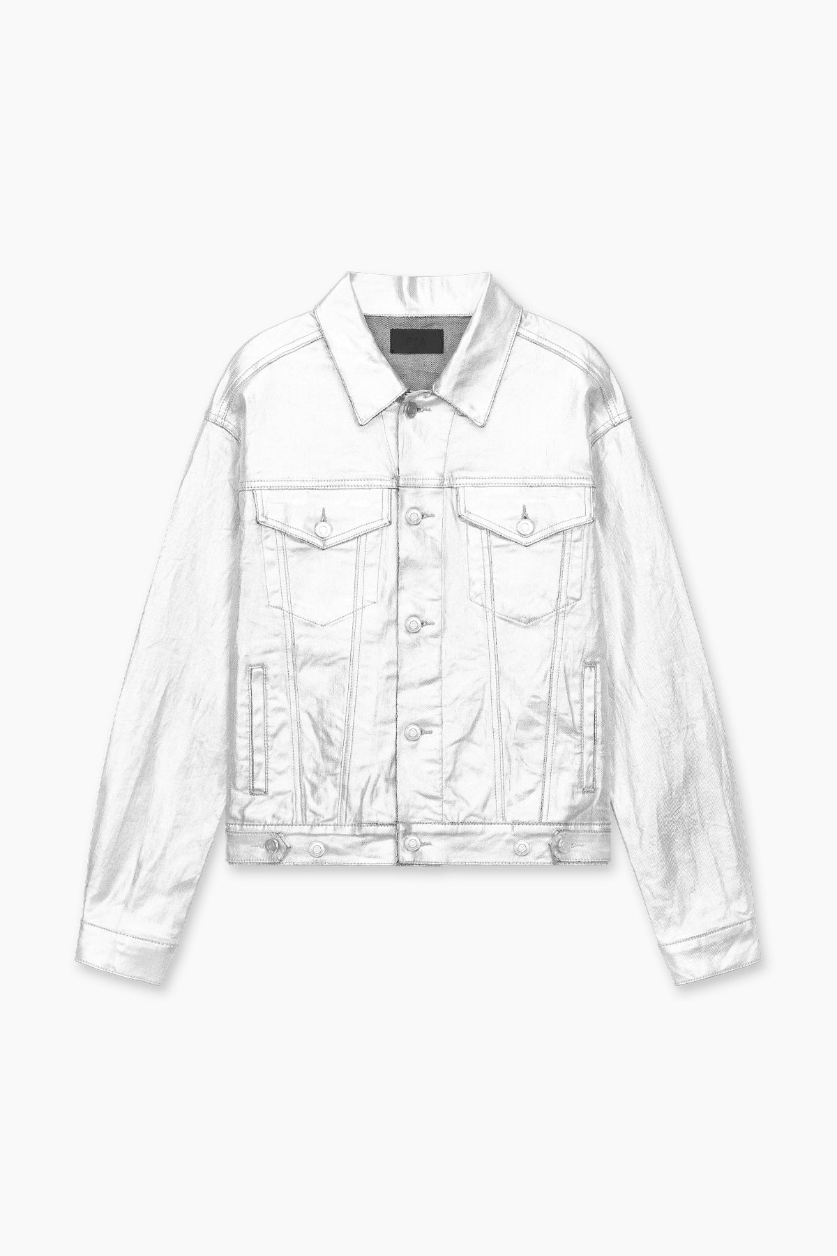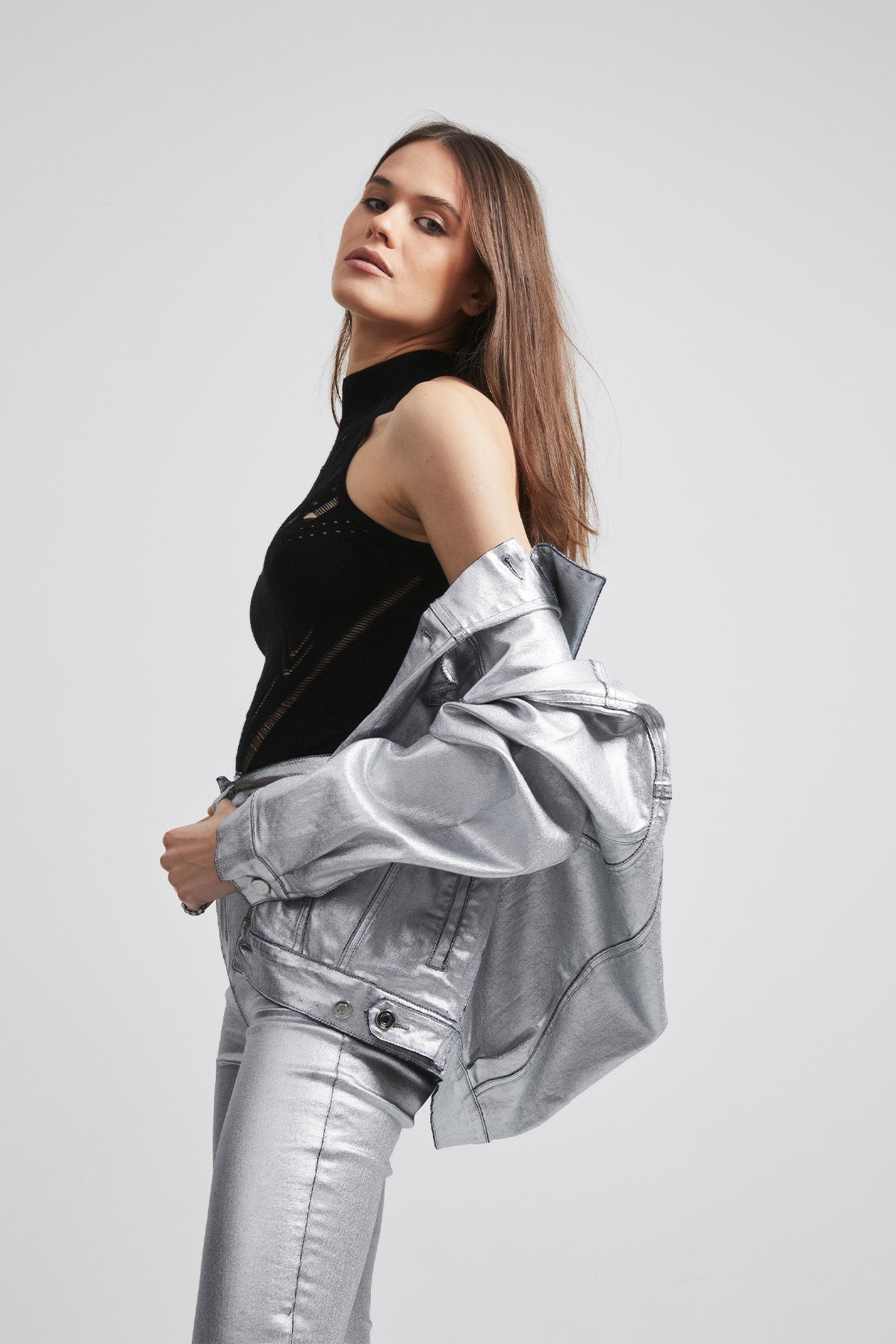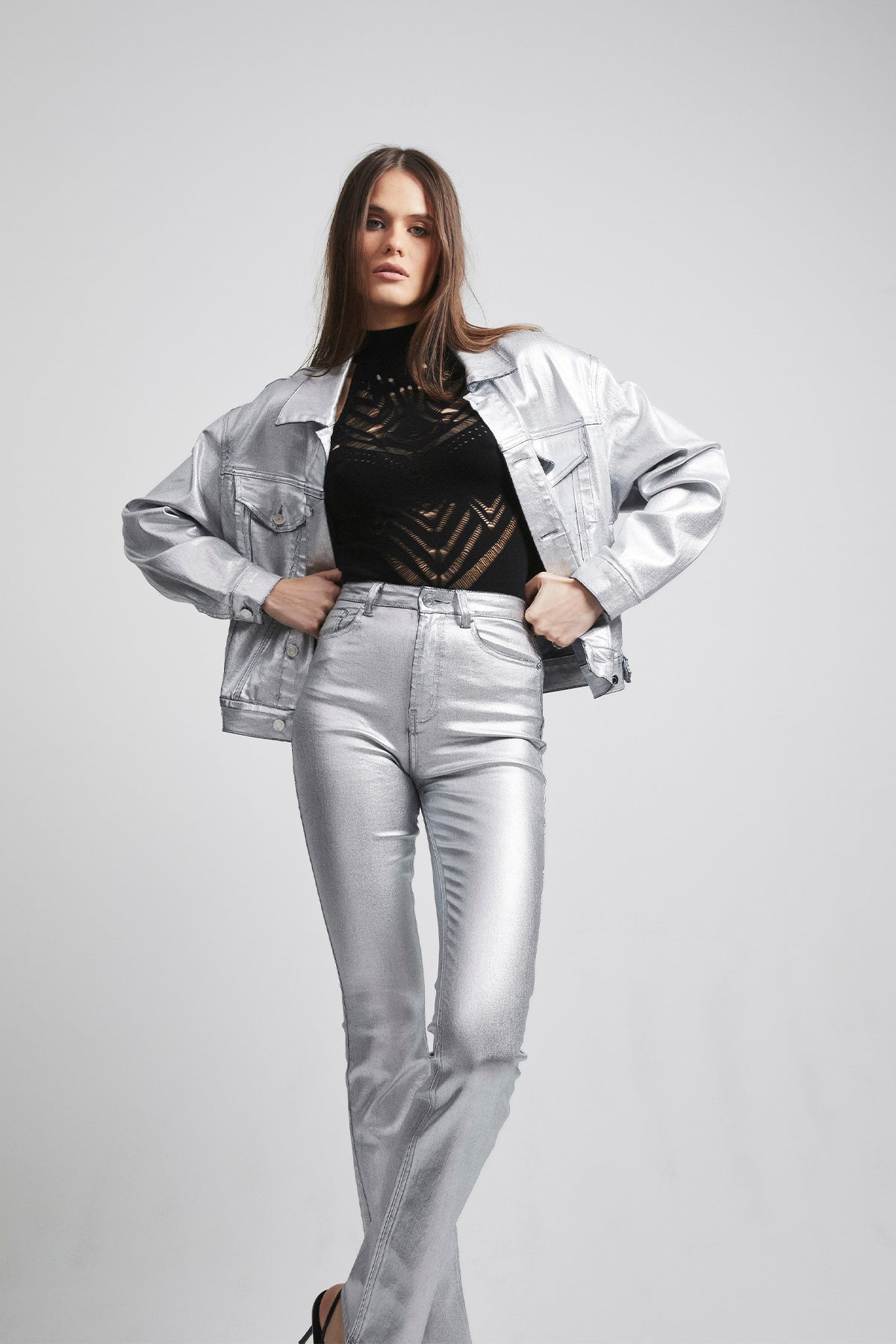 The Odelia Jean Jacket in Silver is a modern take on a classic silhouette. A coated denim jacket equipped with front button closures, chest pockets, side pockets, and a turndown collar. Pair with our Odette Skinny Bootcut Jean in Silver for the perfect look.