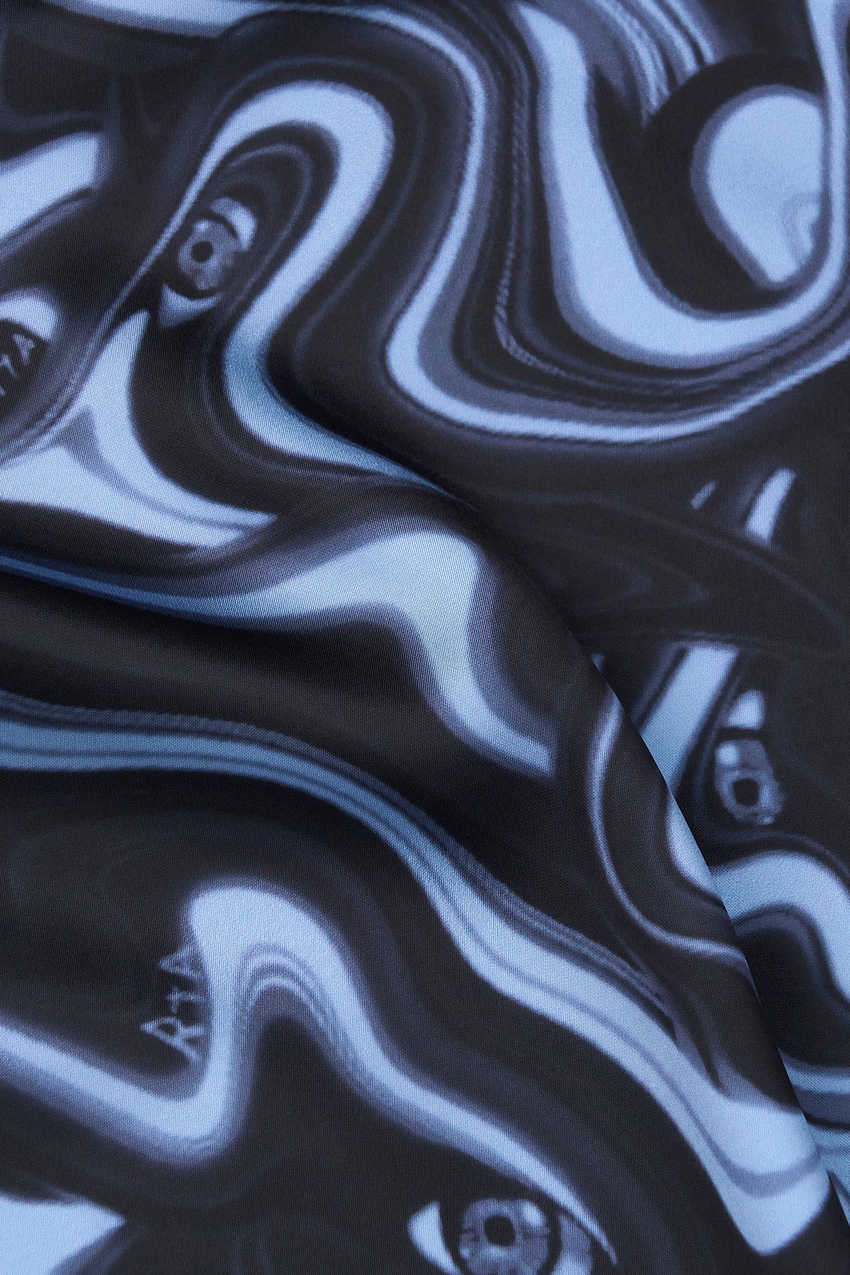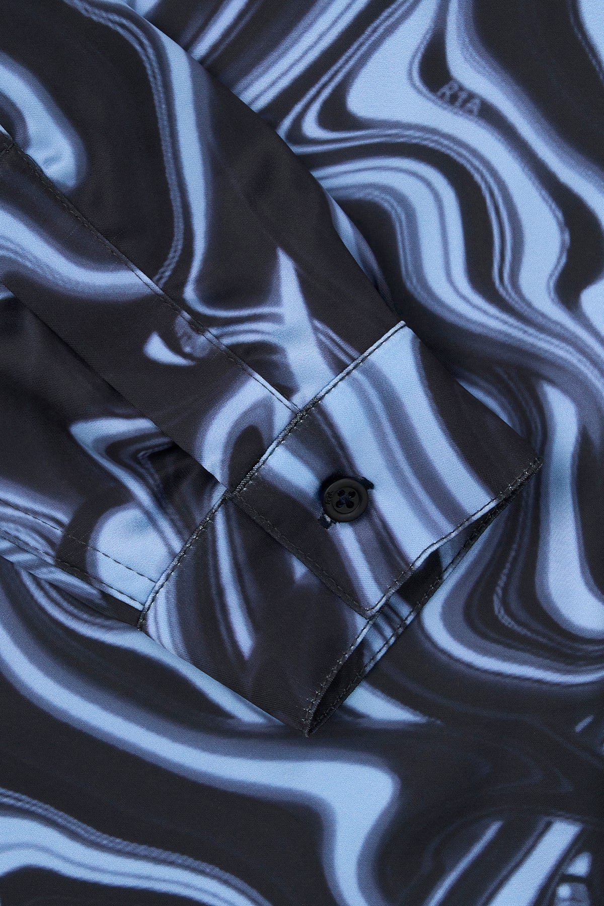 The Omar Button Up Shirt in Blue Angel Eyes is a long sleeve silk shirt designed with a turn down collar, classic button placket, buttoned cuffs, a gently rounded hem and features an all over vortex of angel eyes and hidden RTA logos throughout.
