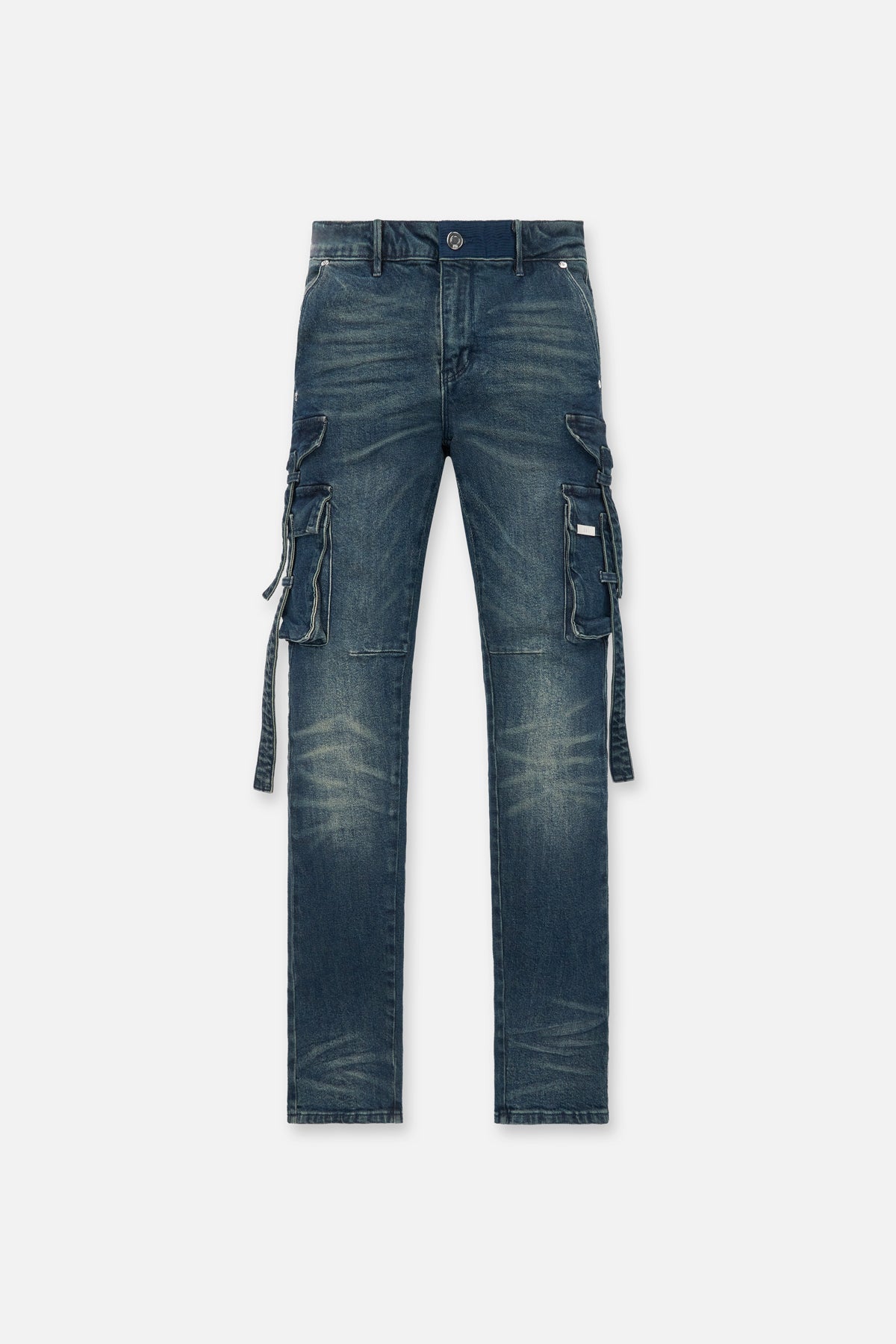 The Peter Cargo Skinny Jean in Deep Sea Drift is made from premium denim. This cargo inspired jean is designed with a skinny fit featuring dual cargo pockets with flap closures and adjustable side straps. Finished with a dark blue wash and a signature RtA metal logo tag.