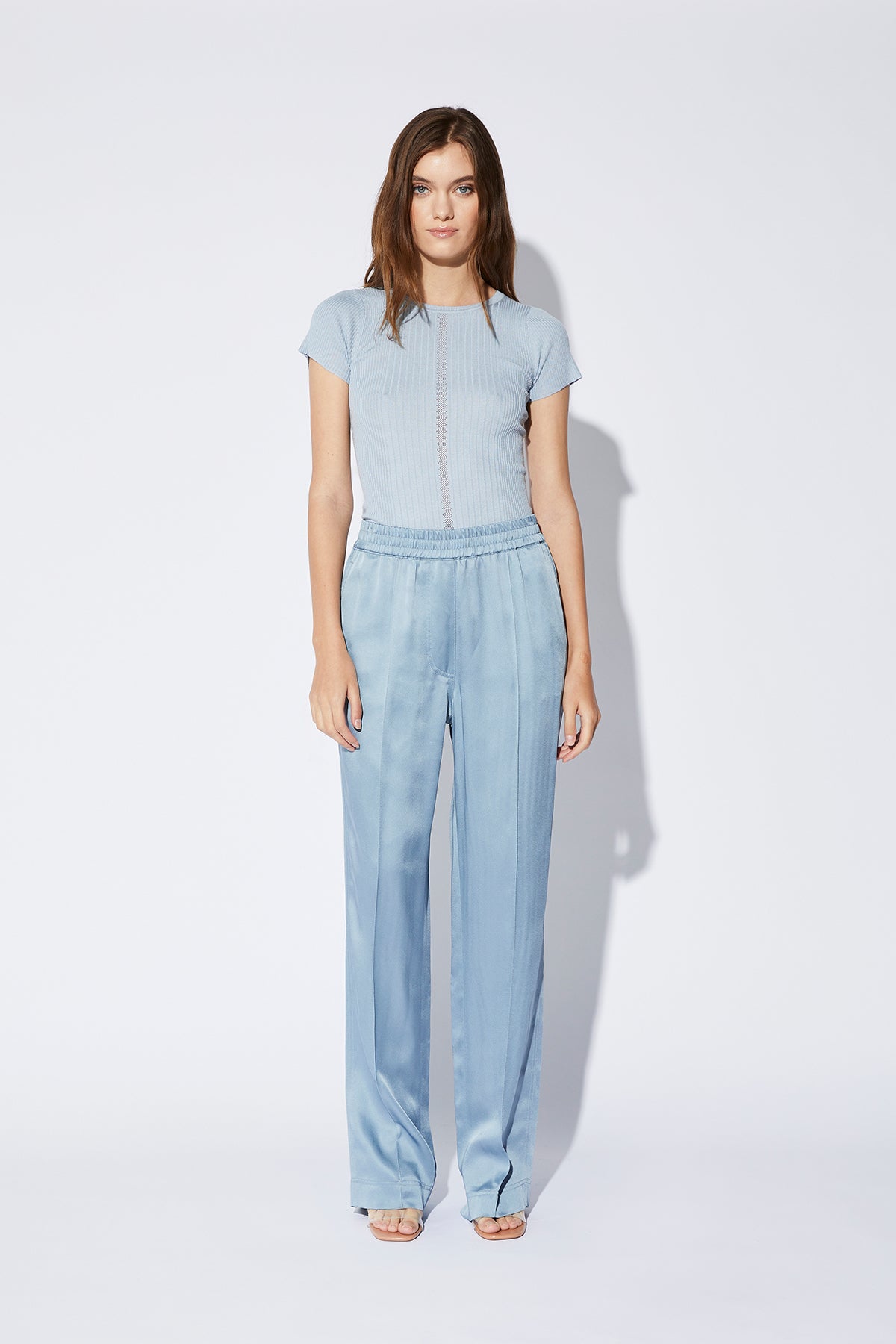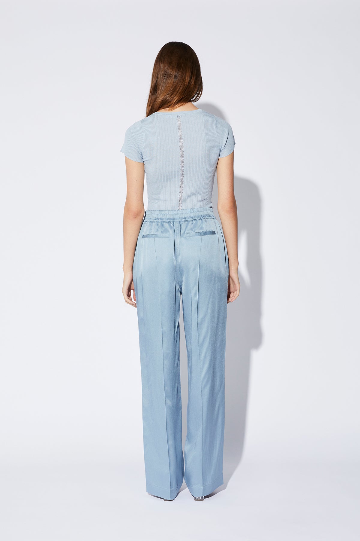 The pull on trouser. This classic trouser in a fluid satin offers an easy yet elegant silhouette. Features pinched seams at front and back and elasticated waistband.
