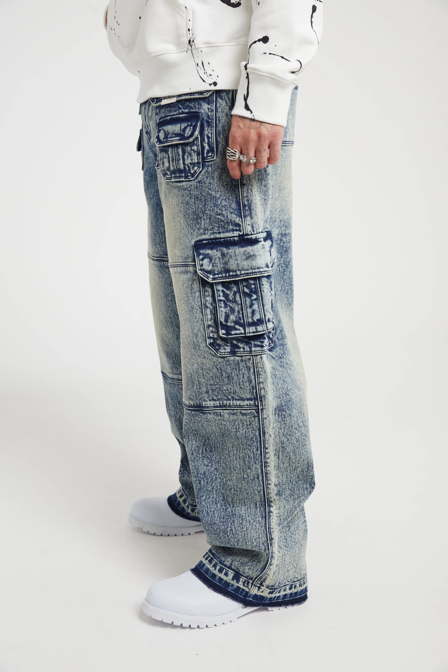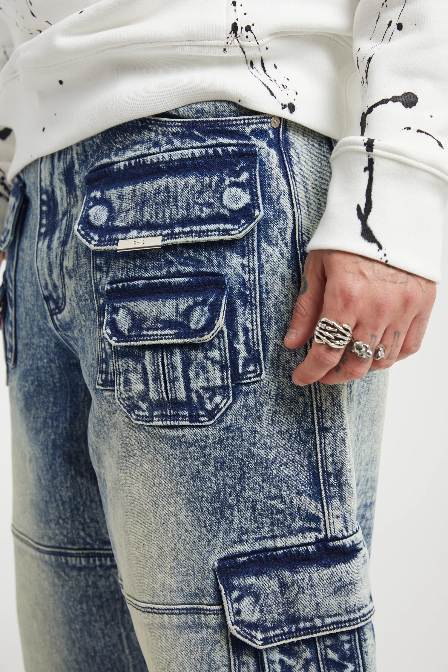 The Roman in Medium Acid Wash is a relaxed, cargo-style jean constructed from premium denim with various utility pockets and undone hems for added elements of raw style. The jean has 13 pockets overall.