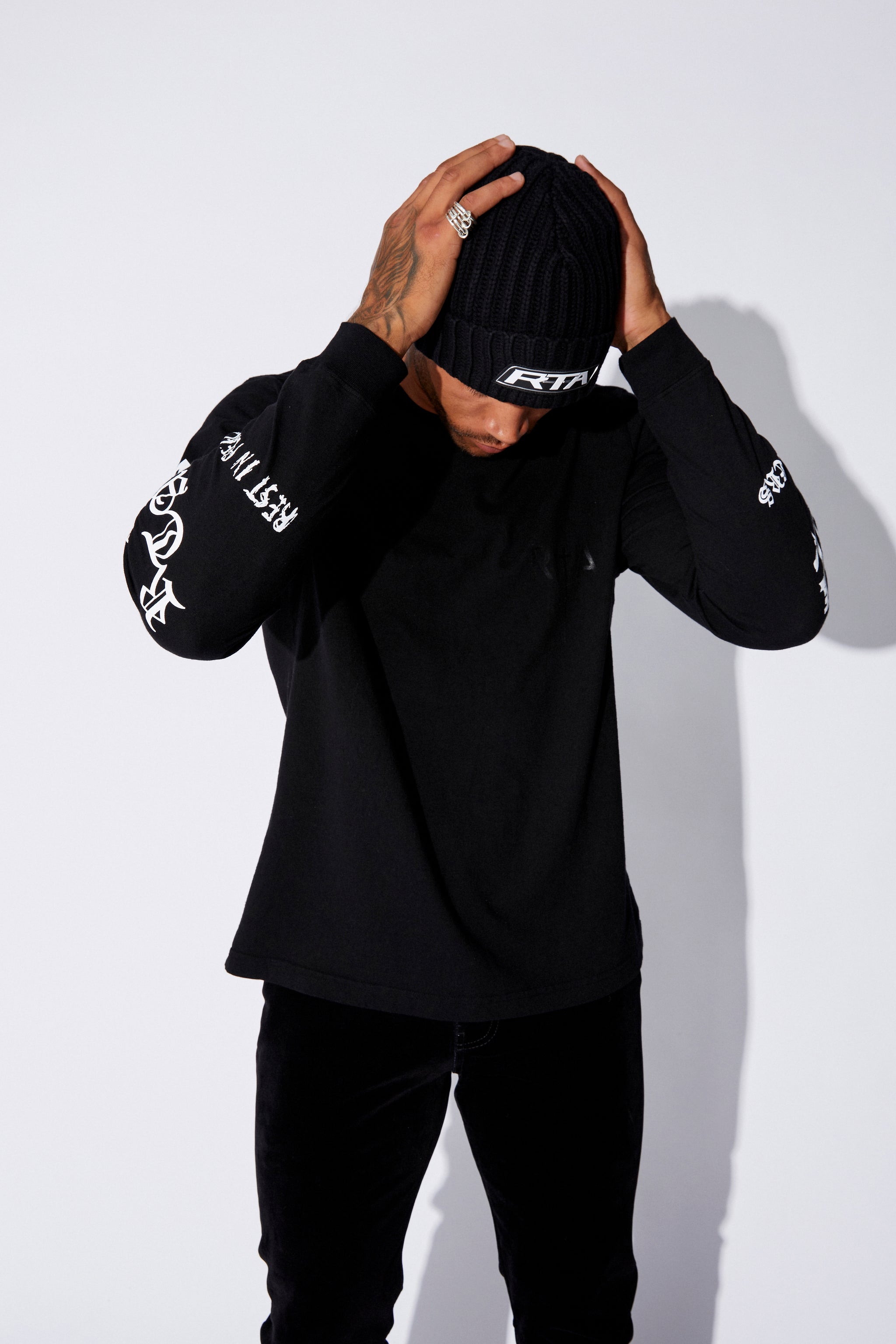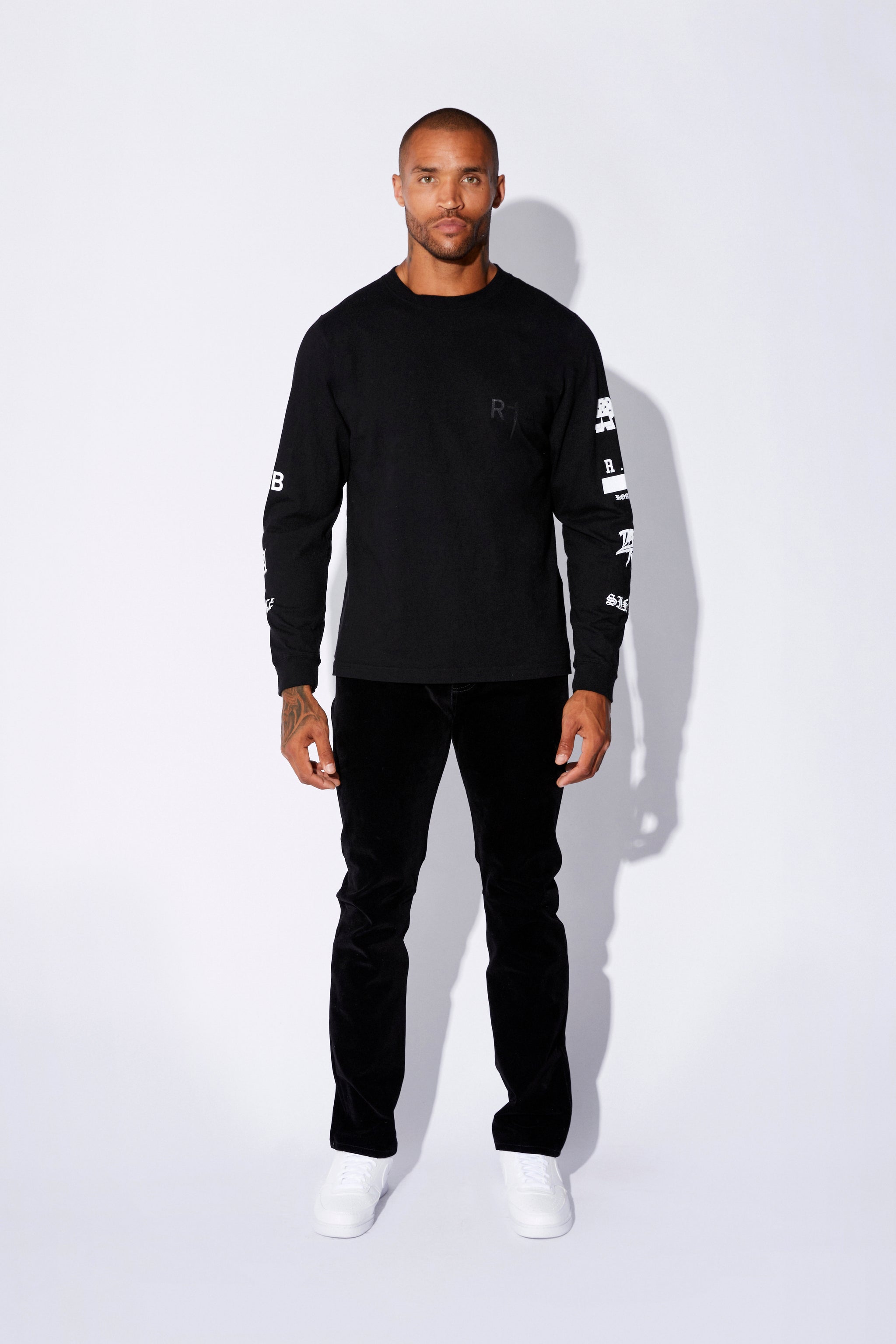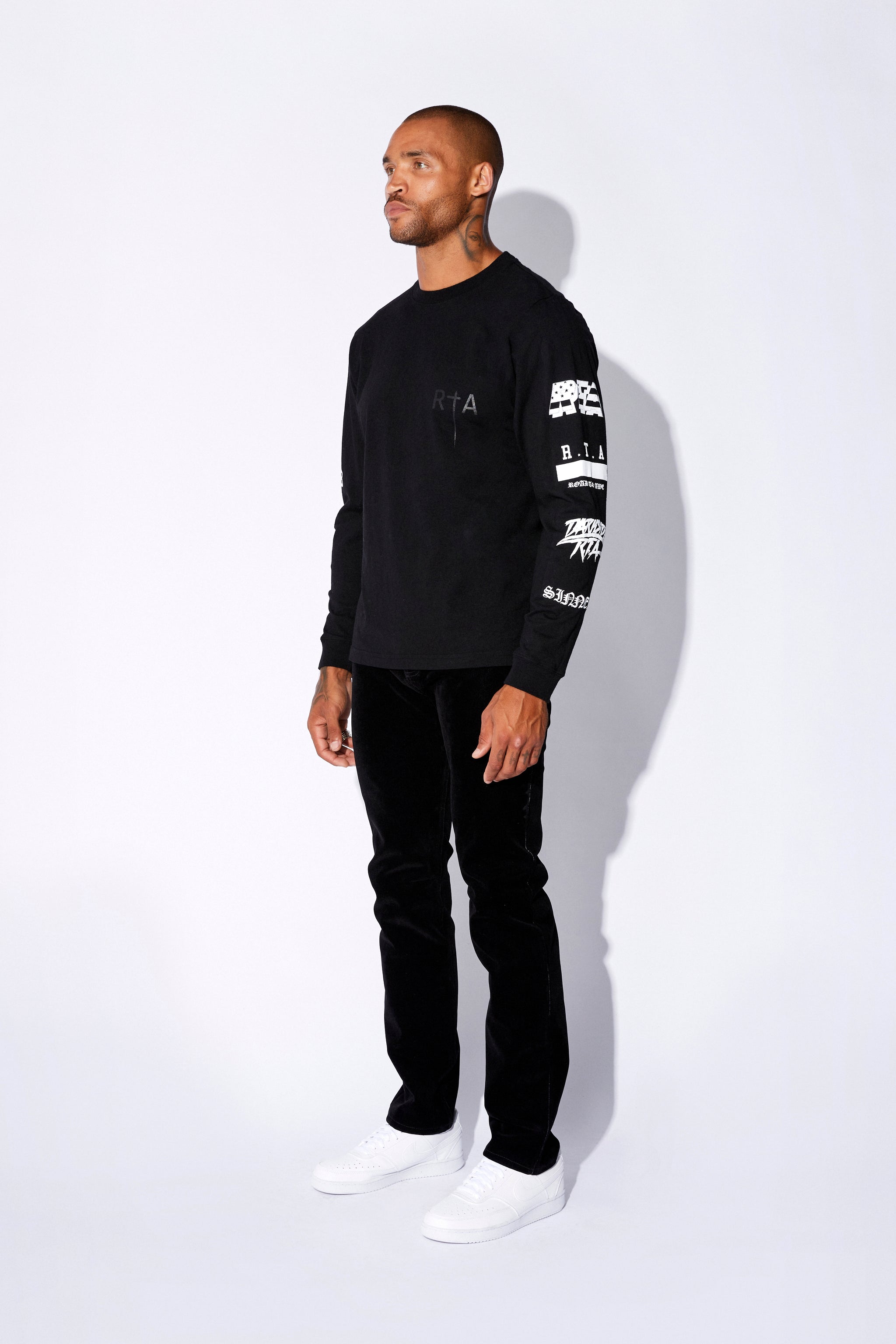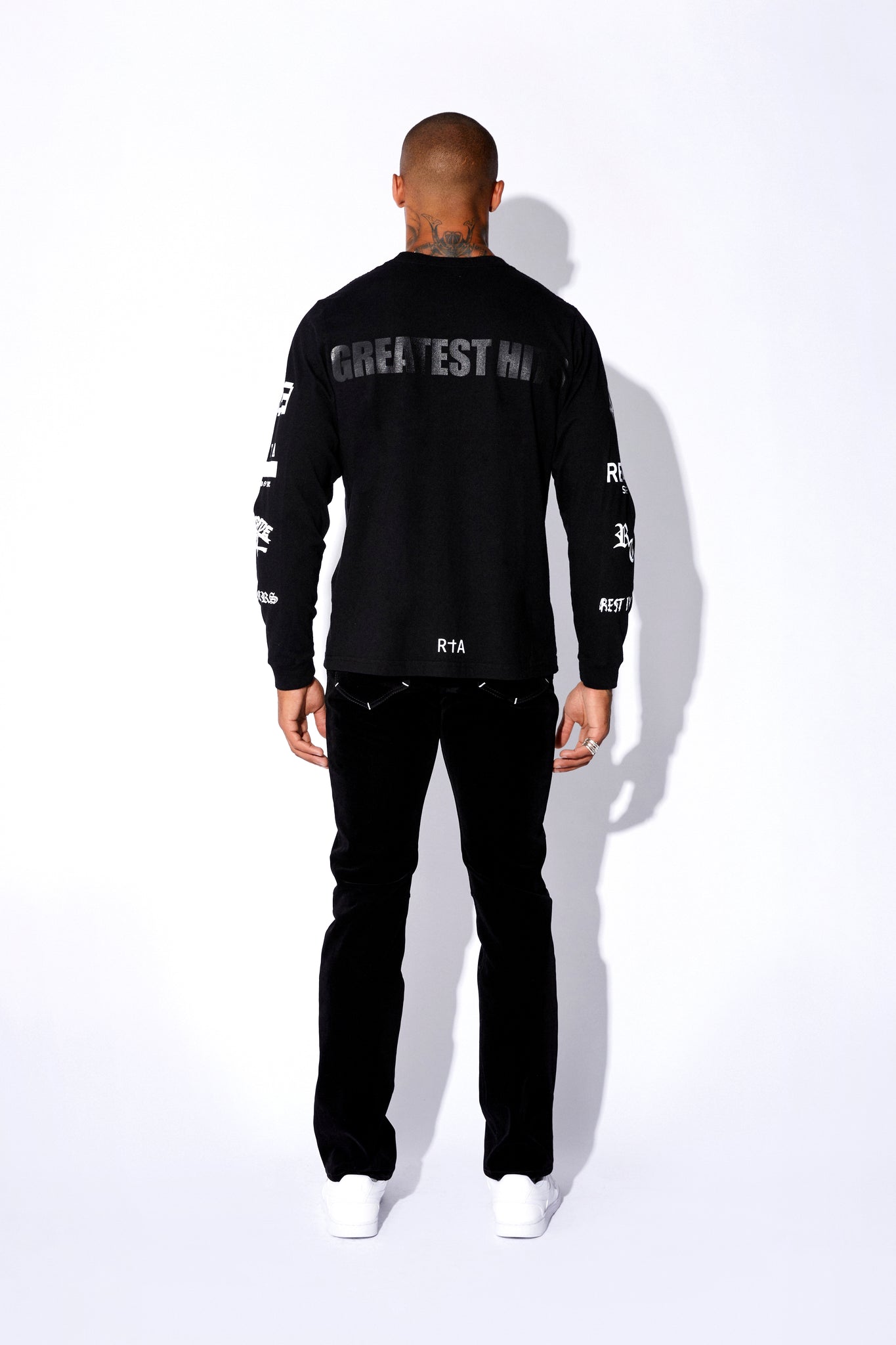 The RTA long sleeve tee in Black Greatest Hits is a cotton crewneck t-shirt featuring graphic print RTA dagger logo on front, "Greatest Hits" on the back and RTA best logos throughout the years on the sleeves.