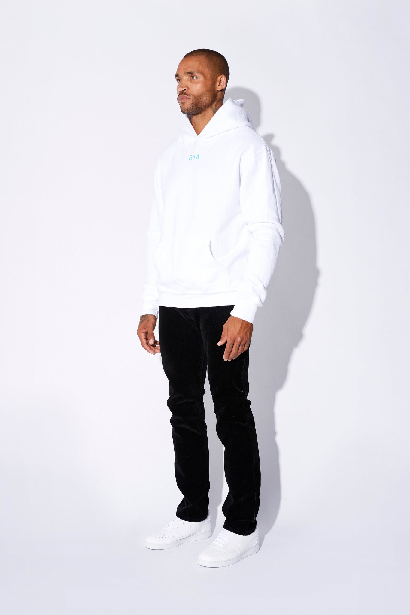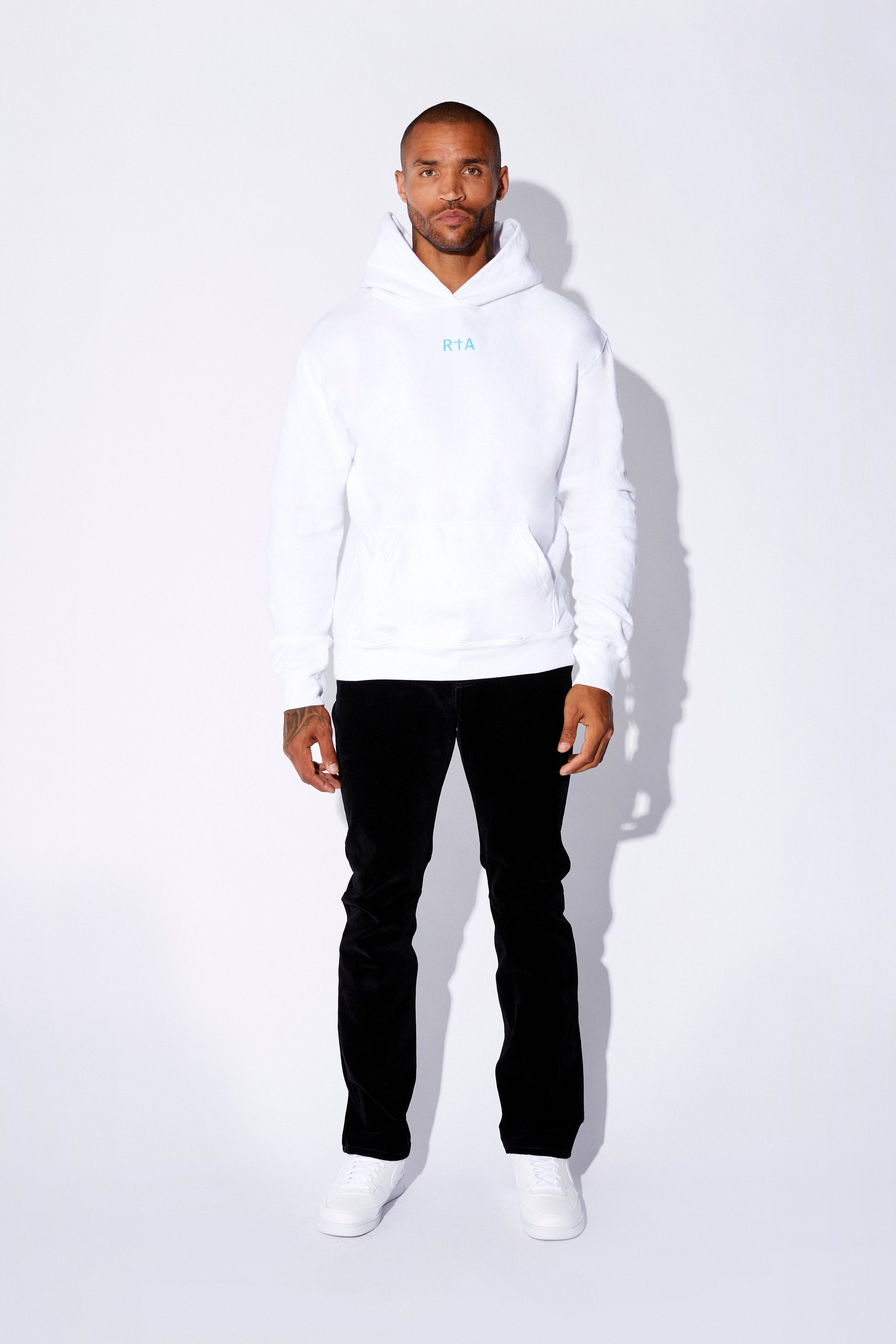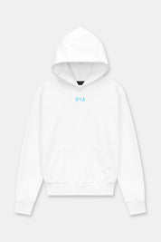 The white cotton hoodie features a small blue RTA logo in the center front.