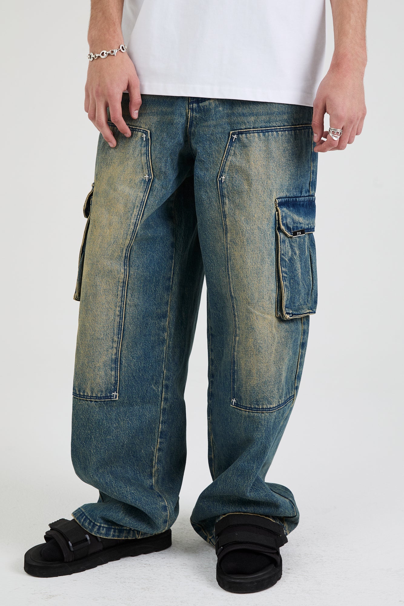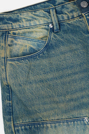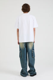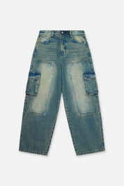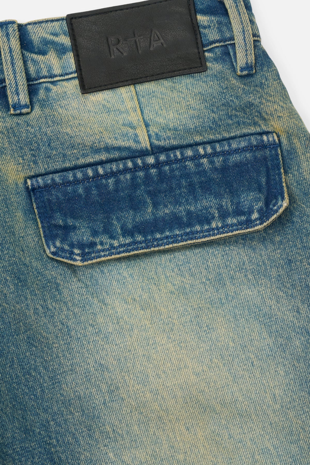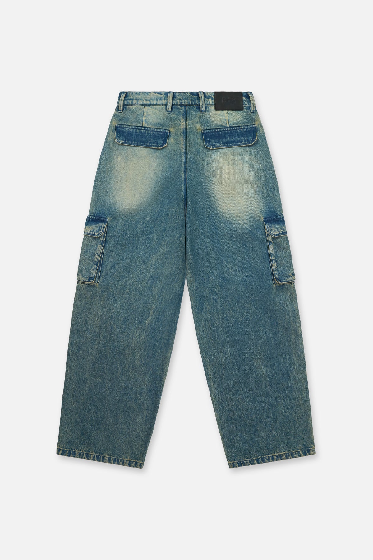 The Ryan Wide Leg Carpenter Jean in Blue Mineral is made from premium denim. Designed with a mineral blue wash, baggy fit, cargo style pockets on both legs, back pockets, and front stitch detailing for added dimension and texture. Finished with the signature RTA leather patch on the back waistband.