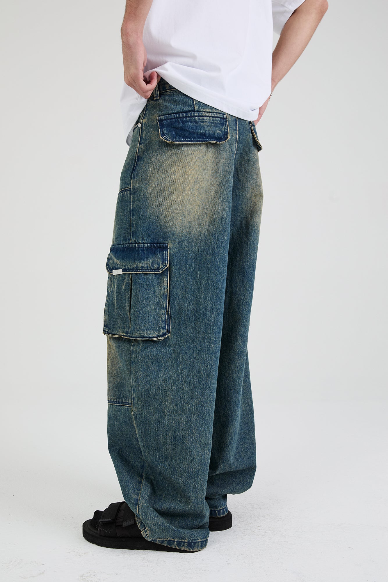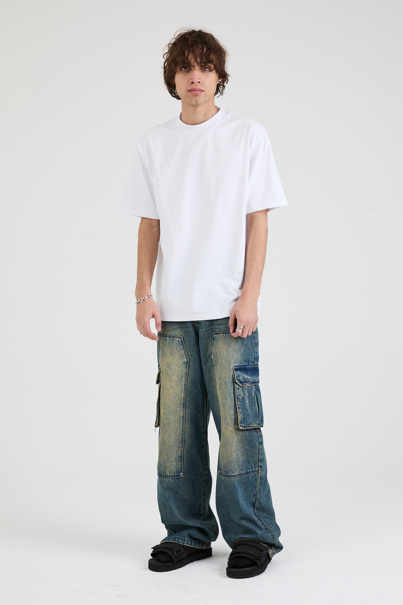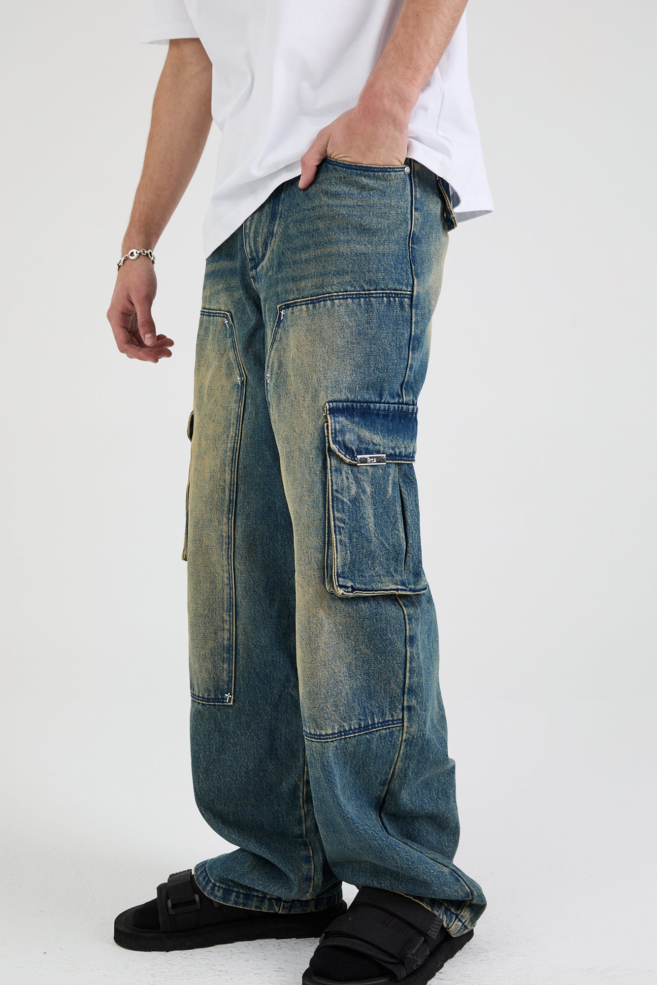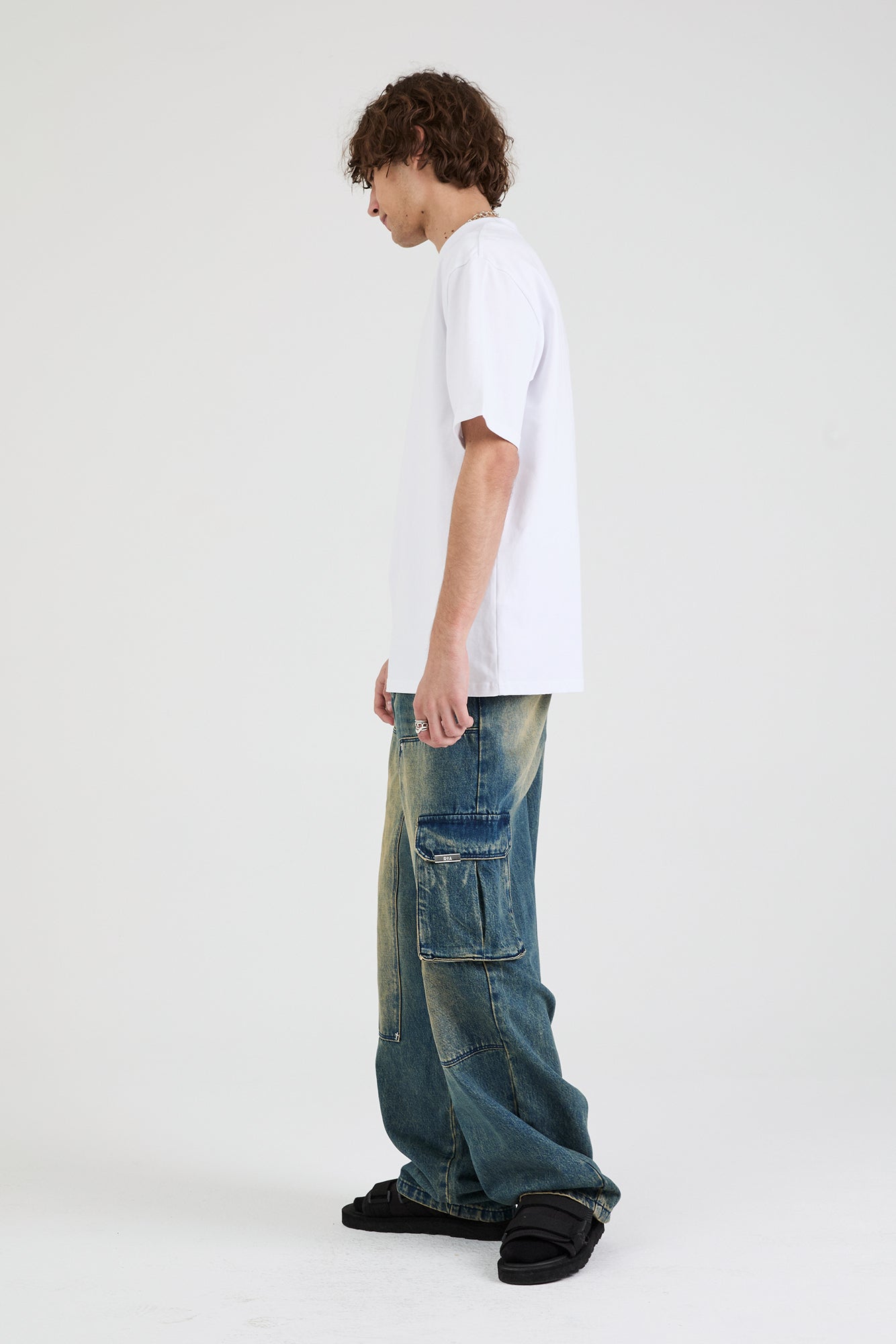 The Ryan Wide Leg Carpenter Jean in Blue Mineral is made from premium denim. Designed with a mineral blue wash, baggy fit, cargo style pockets on both legs, back pockets, and front stitch detailing for added dimension and texture. Finished with the signature RTA leather patch on the back waistband.