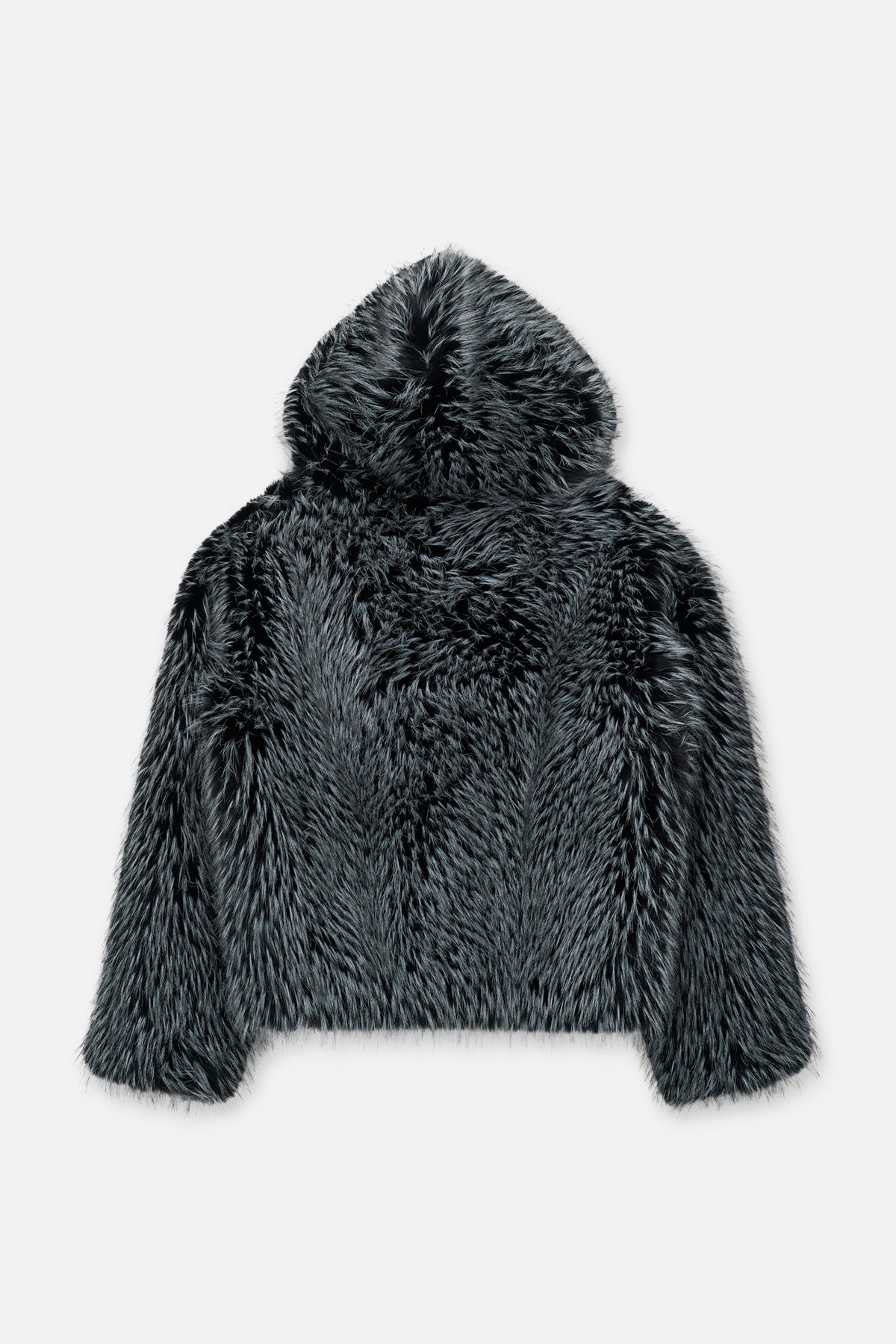 The Sam Jacket in Noir Blueflare is a faux fur jacket designed with a hooded silhouette. This jacket features a zip front closure, front pockets, and finished with blue-tinted black fur.