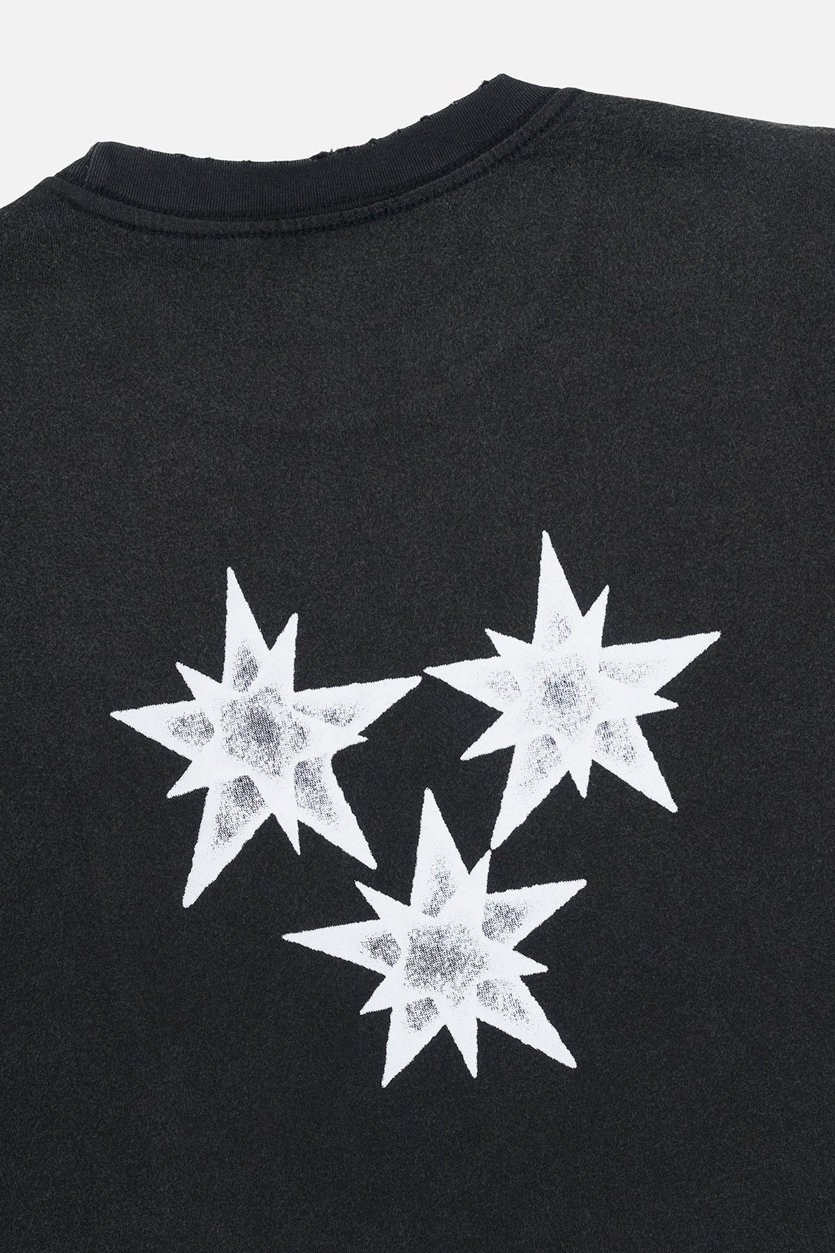 The Sean Layered Tee in Black Smokey RtA is made from 100% Cotton and designed with a built-in long sleeve under layer. This tee features subtle distressing at the collar and hem, a warped logo graphic at the chest, bold graphic hits down the sleeves, and a triple-star print across the back, finished with a vintage black wash.