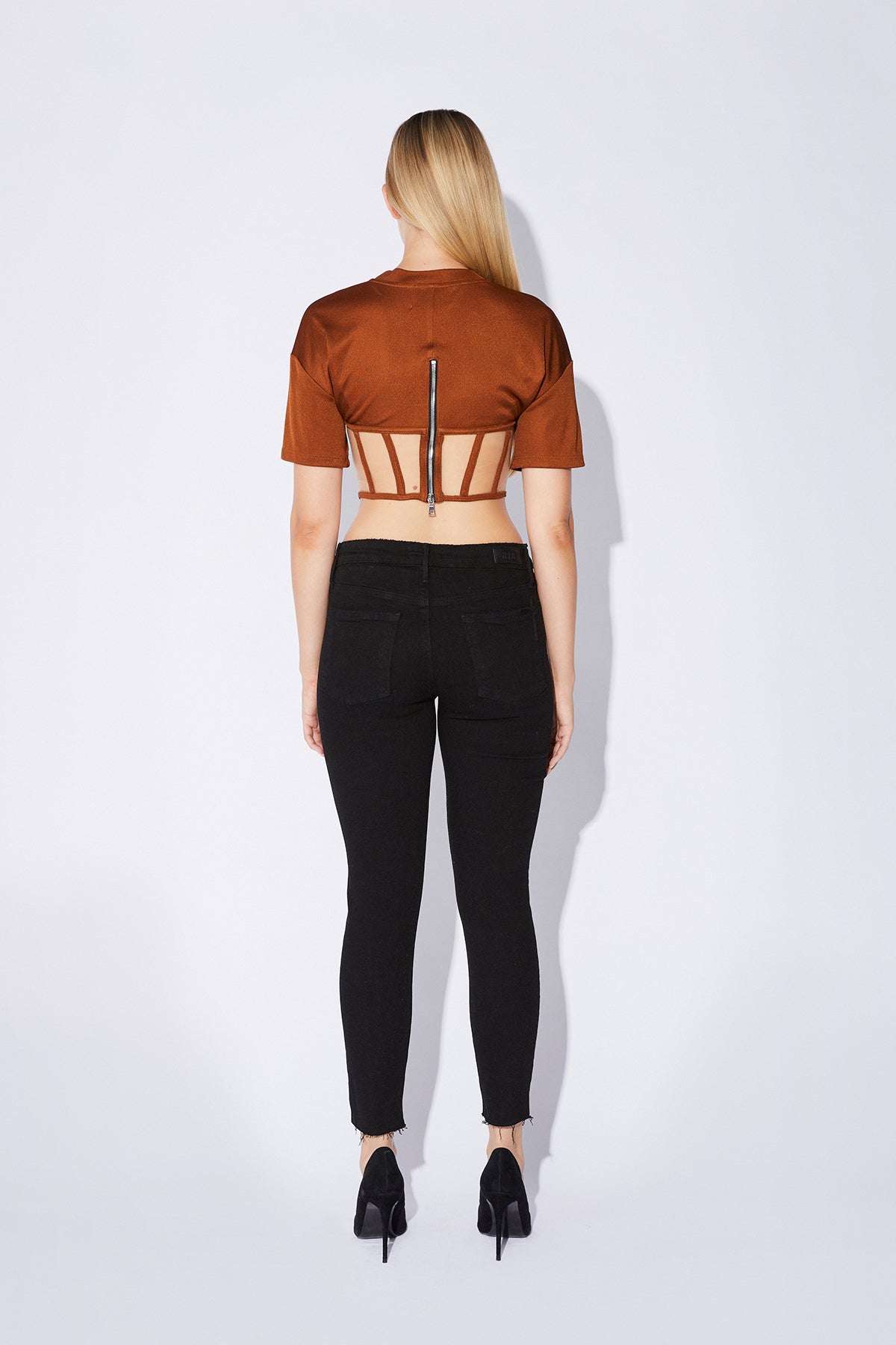 The Short Sleeve Corset Top in cognac is our best selling RTA Angelo Top in a slinky fabric. This top elevates the everyday staple into a statement piece. Cut for a slim fit through the body with a relaxed upper, this crew neck, short sleeve corset tee features transparent mesh boning throughout with a dipped front and centre back exposed zip.
