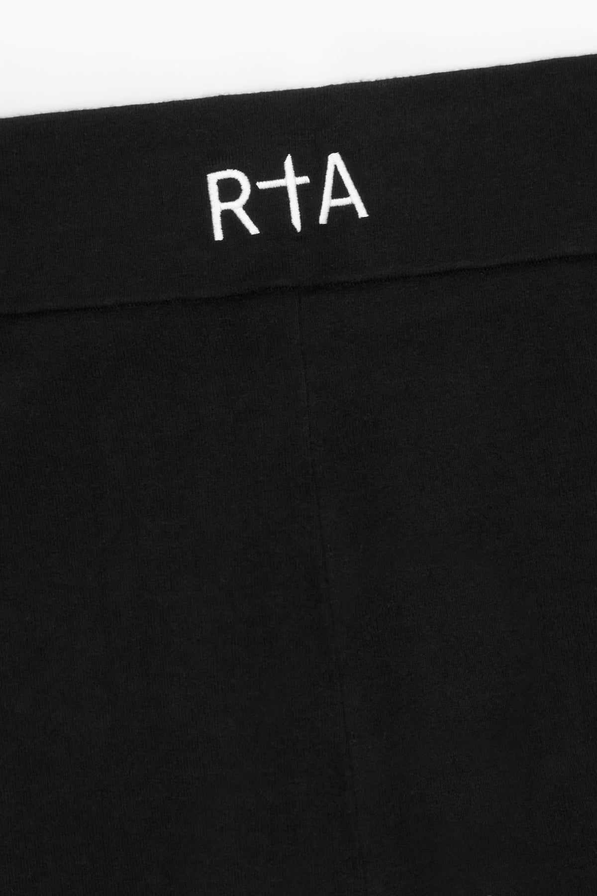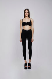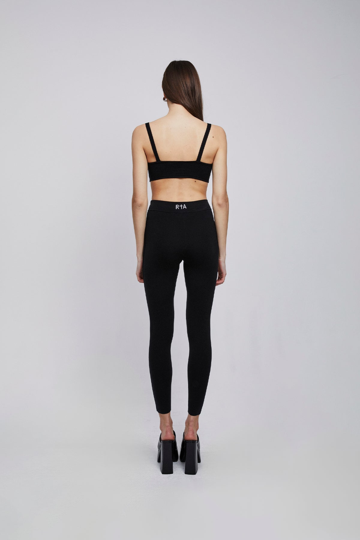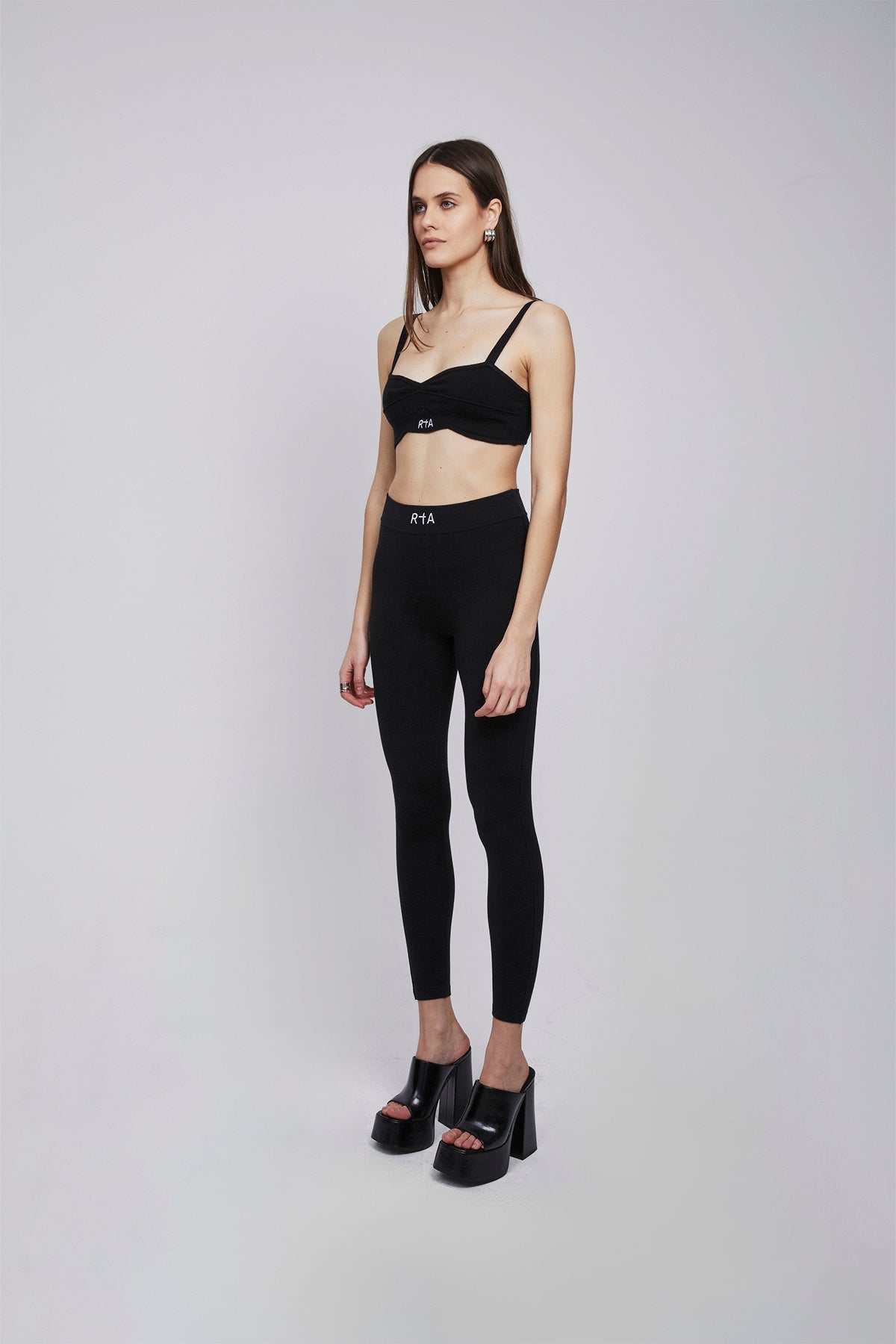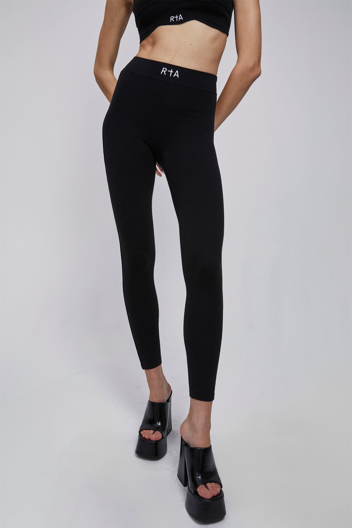 As part of our new activewear collection, the Sibille Legging in Black is cropped in length with an elastic waistband that features a monochromatic RTA logo on the front and back, ribbed detailing, and a topstitch design. Pair with our Nour and Nyra Tops in Black for the perfect look.