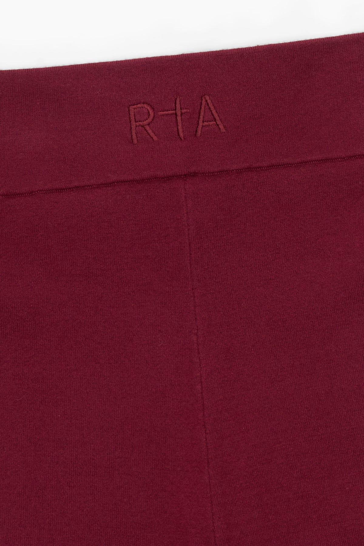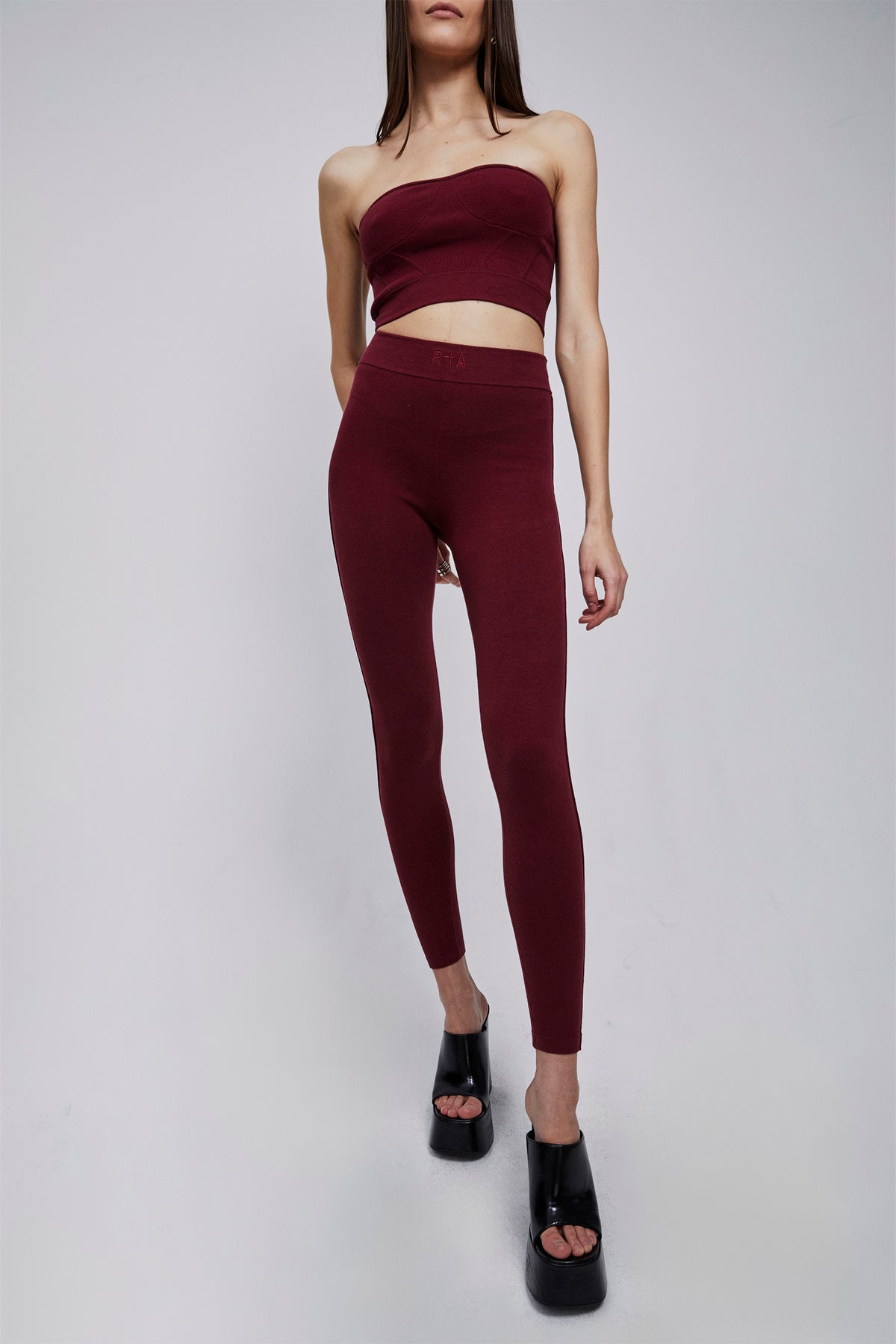 As part of our new activewear collection, the Sibille Legging in Bordeaux is cropped in length with an elastic waistband that features a monochromatic RTA logo on the front and back, ribbed detailing, and a topstitch design. Pair with our Nour and Nyra Tops in Bordeaux for the perfect look.
