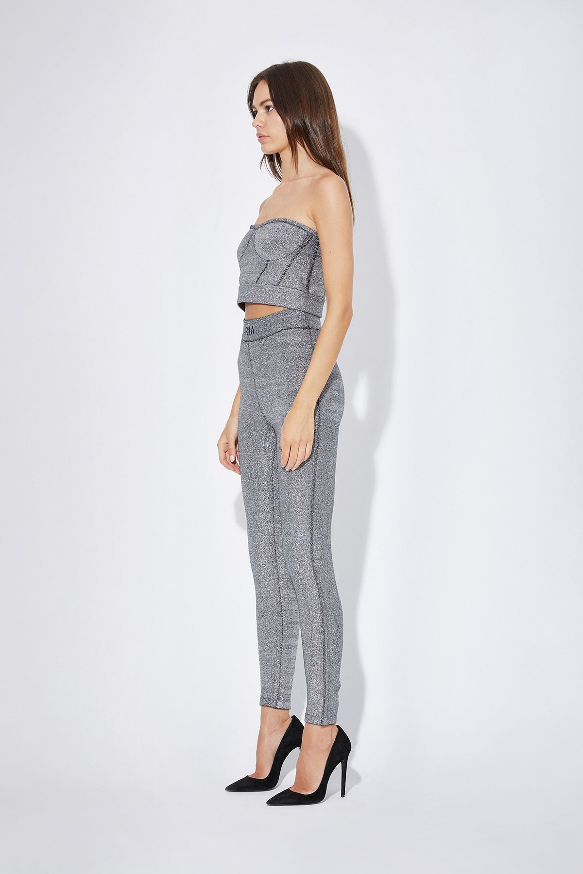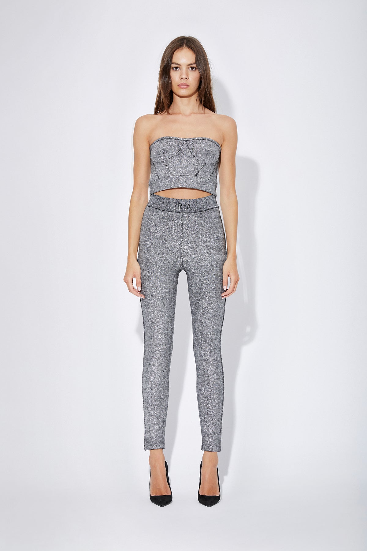 The RTA Sibille legging in silver lurex features our newest stretch cotton fabrication called RTA Skin. This versatile piece is an ankle-grazing pant with RTA logo on the front. The back band provides a sparkly, body-hugging silhouette.