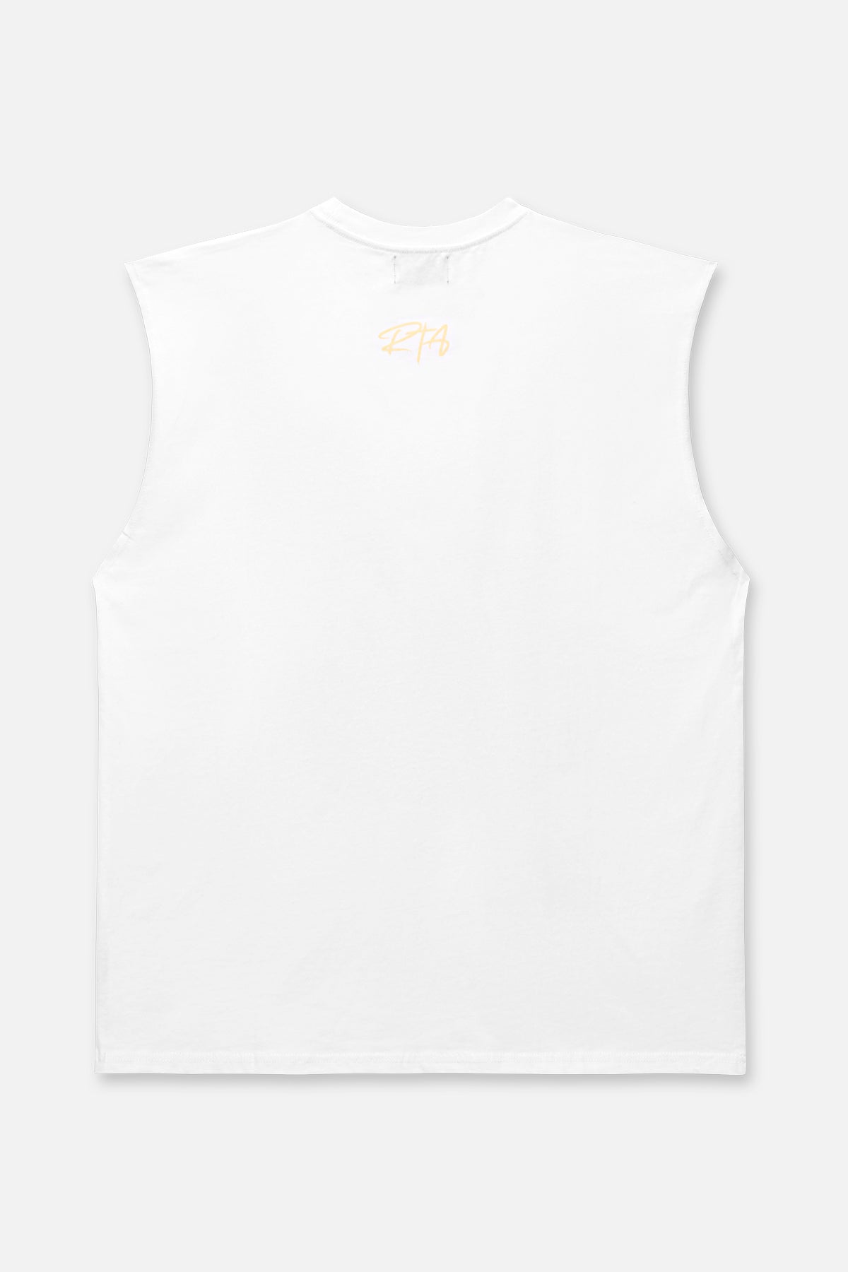 The Terry Muscle Tee in White Car Drift is an oversized, crew neck muscle tee crafted from 100% cotton. This tee features original RTA artwork of a car drifting through the streets of Los Angeles and a small RTA logo on the back of the neck.