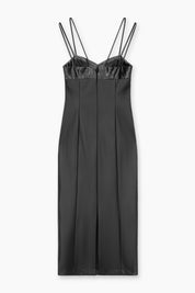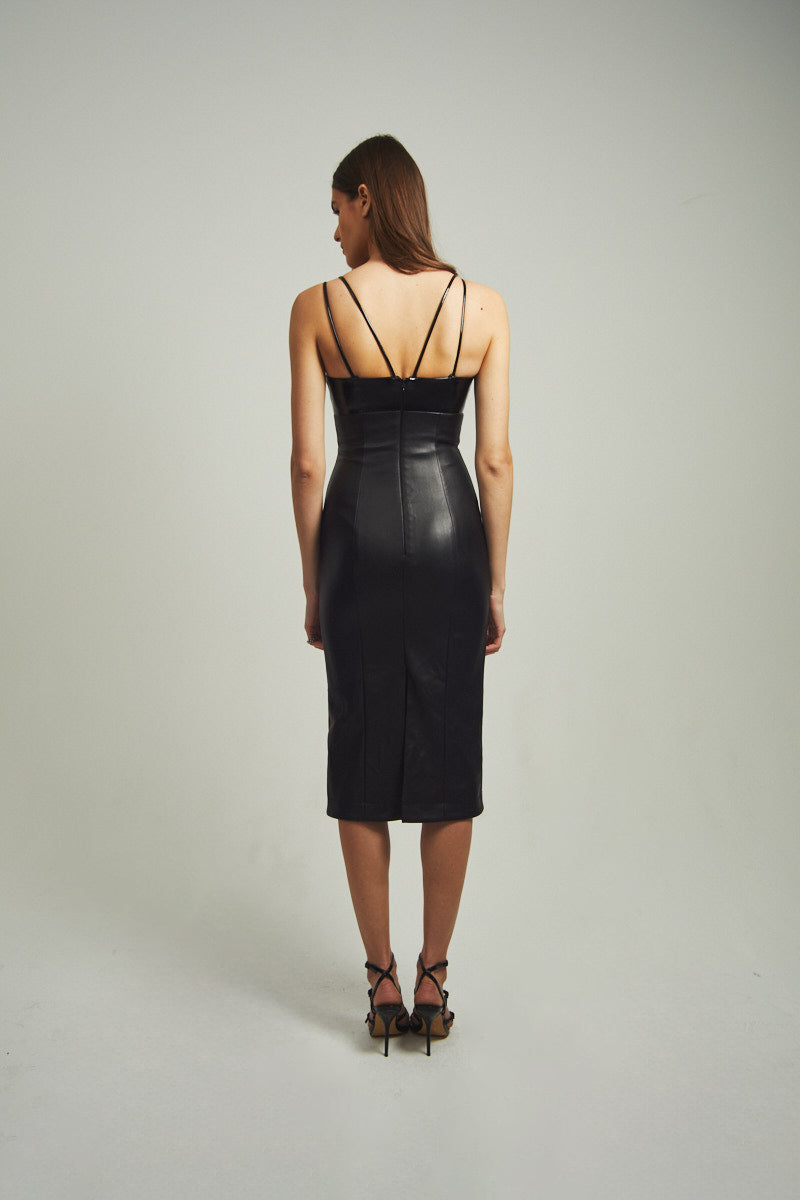 The Uma Cut Out Midi Dress in Black is a midi length dress with a sweetheart neckline, cut out detail beneath the chest, dual spaghetti straps, and zipper closure in the back.