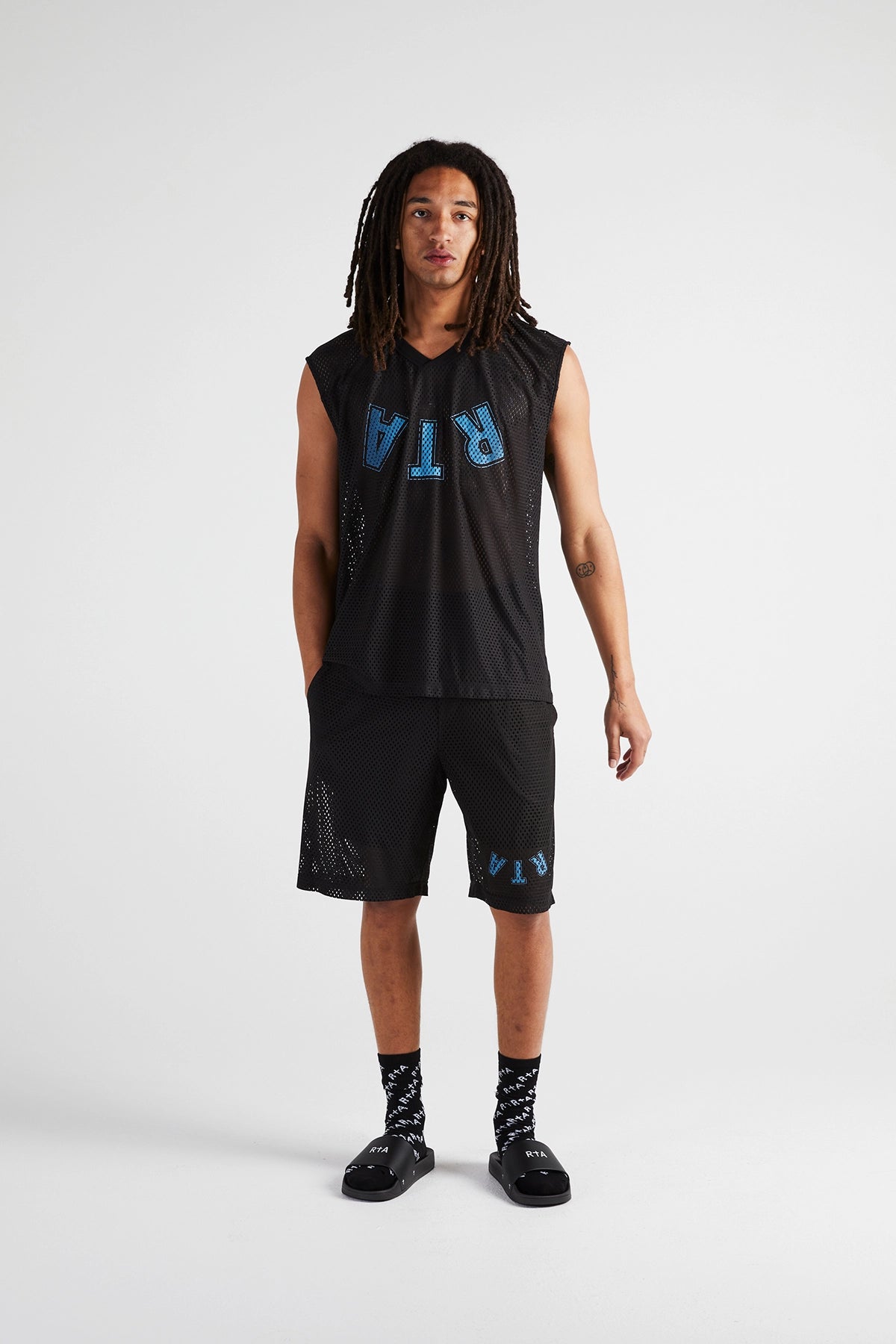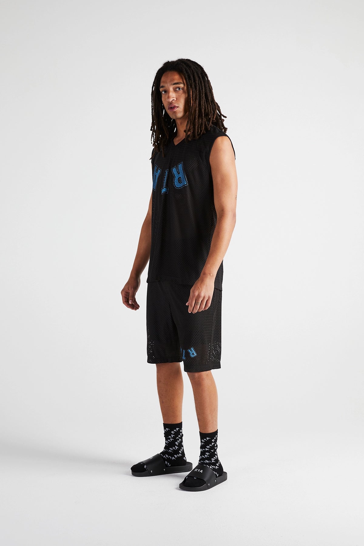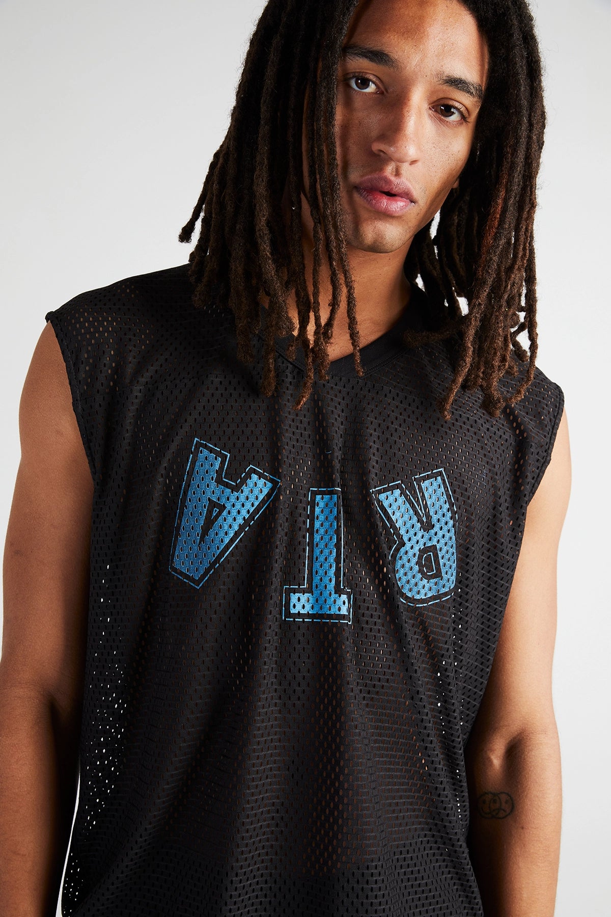 RtA's V-Neck Sleeveless Mesh Tee features our signature logo in an upside down print, crafted from a breathable mesh fabric.