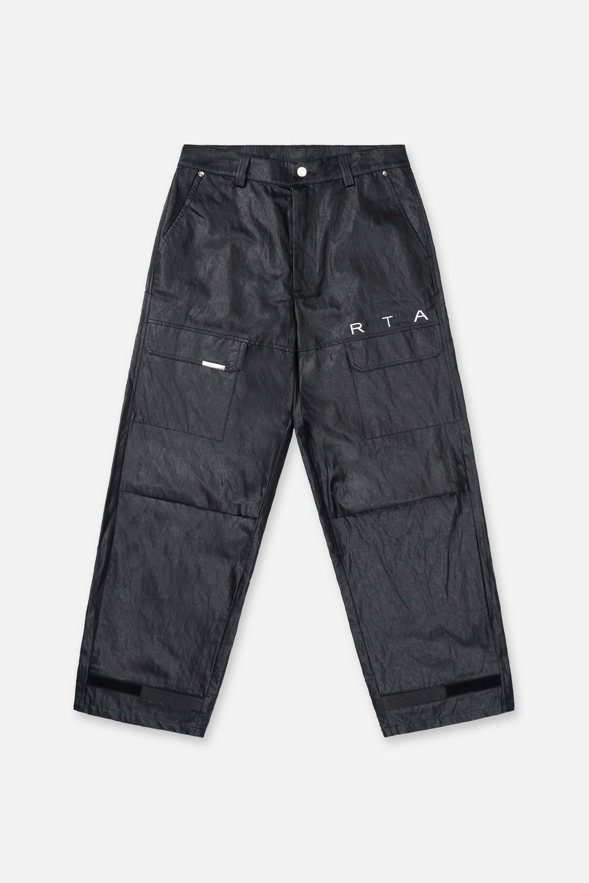 The Wylie Cargo Pant in Shiny Black is made from an eco leather blend. These pants are designed with an oversized, baggy fit and feature cargo style pockets, the RtA logo on the thigh, logo plaque, velcro leg cuffs, and signature leather patch on the back waistband.