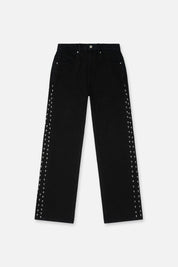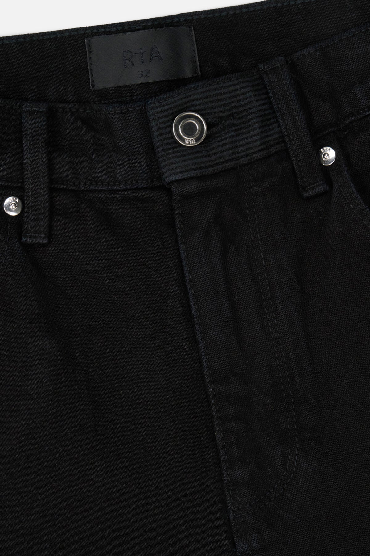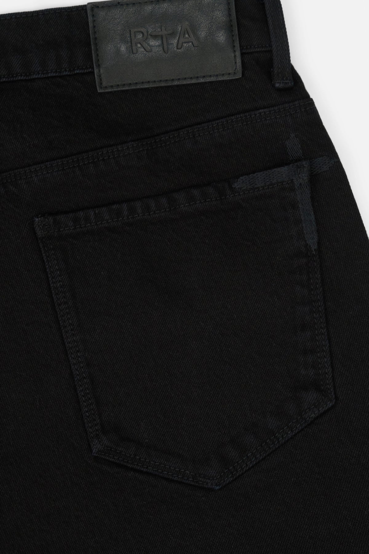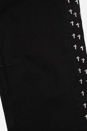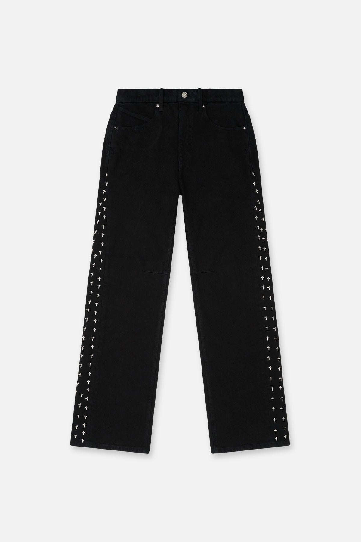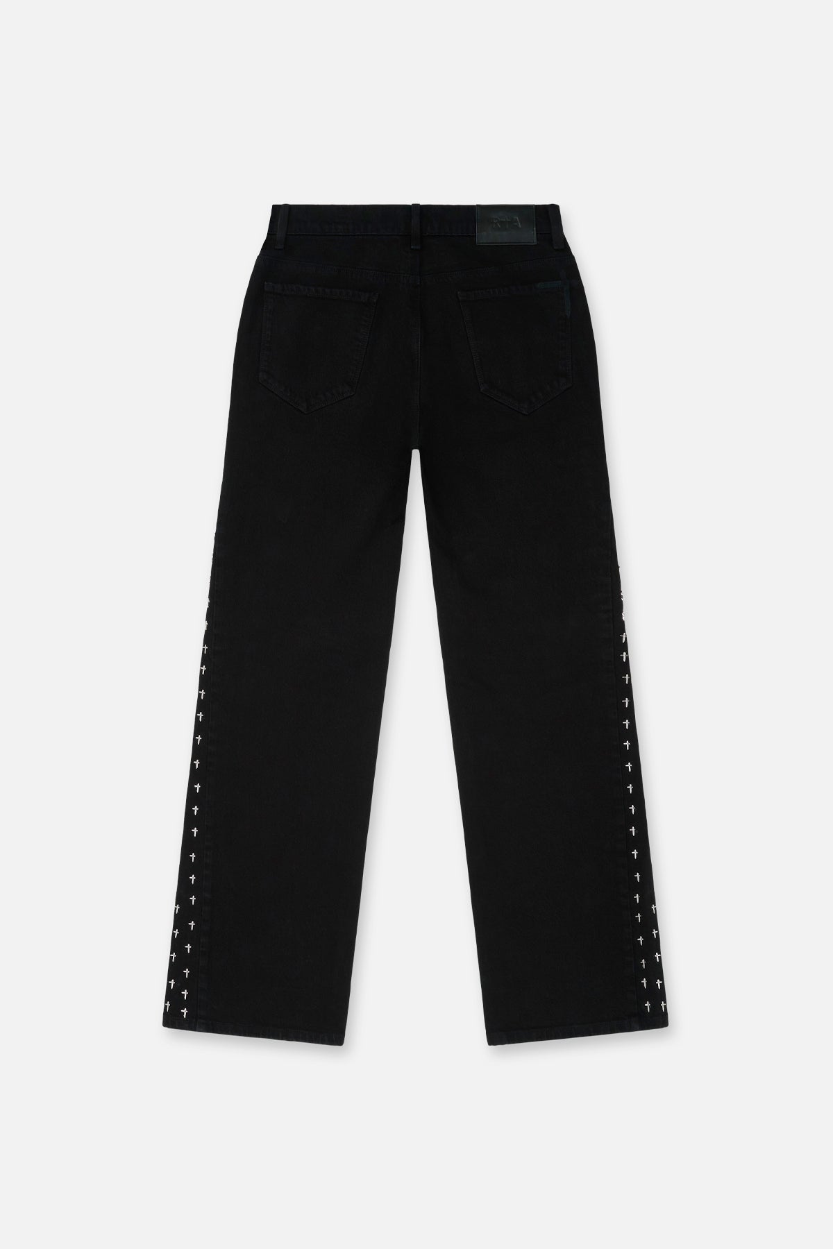 The Zed Straight Leg Jean in Black Cross Panels is is made from premium denim. These jeans are designed with a straight leg fit and feature panels of silver cross emblems opening up down the sides of the legs, reinforced stitching on the inner thighs, the iconic RTA cross on the back pocket, and signature leather patch on the back waistband.