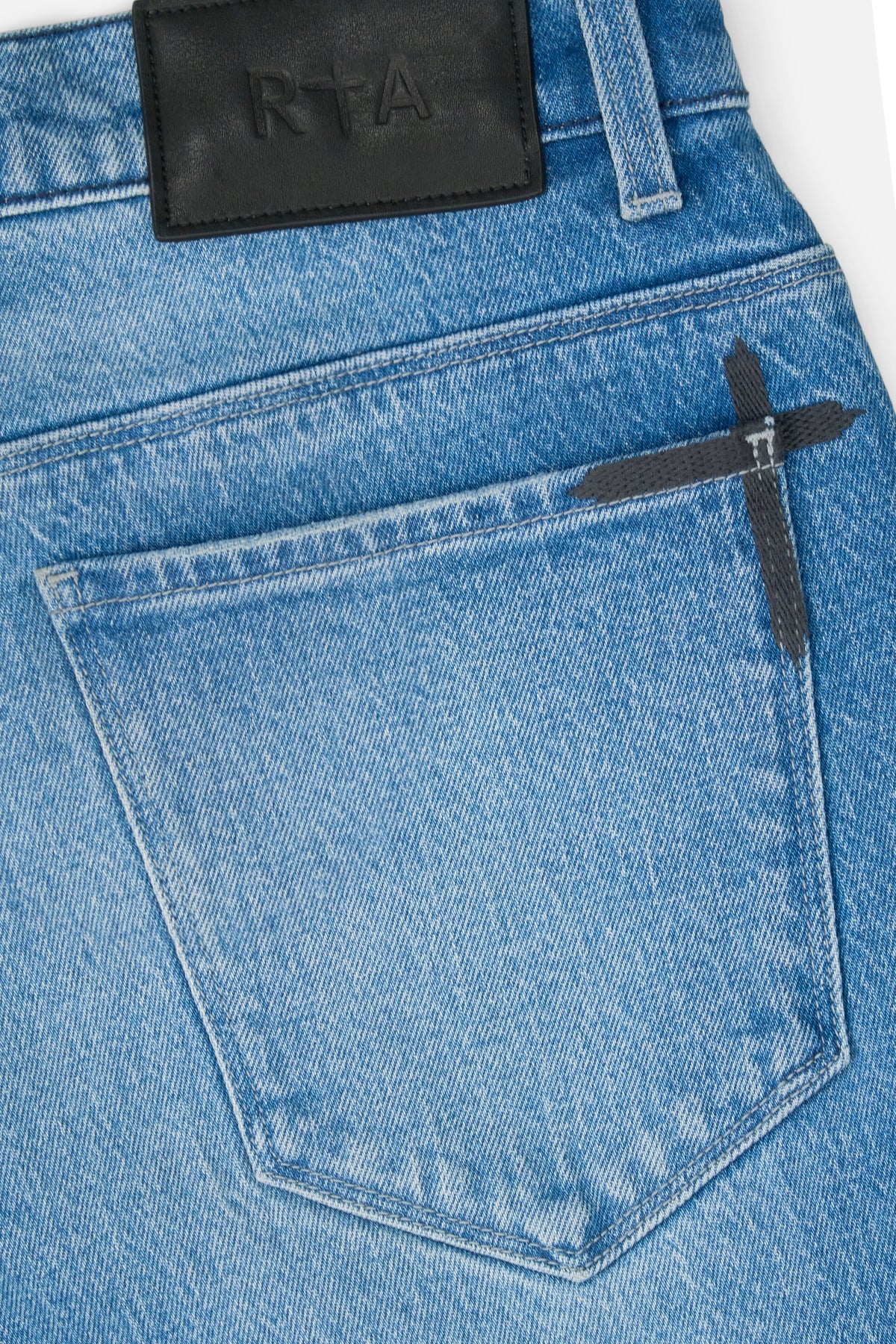 The Zed Straight Leg Jean in Blue Cross Panels is is made from premium denim. These jeans are designed with a straight leg fit and feature panels of silver cross emblems opening up down the sides of the legs, distressed detailing, reinforced stitching on the inner thighs, the iconic RTA cross on the back pocket, and signature leather patch on the back waistband.